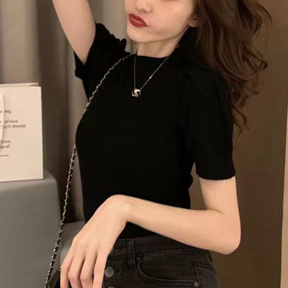ニットソー ハーフタートルネック パフスリーブ リブニット 無地 トップス オフィスカジュアル 細見え