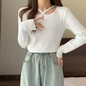 大人女性に合う上品なクロスネックデザインのリブニットトップス
