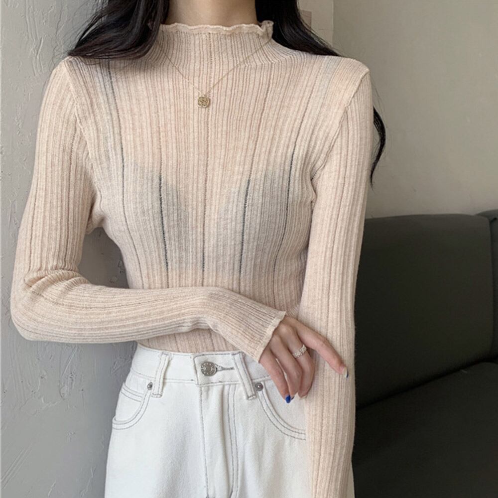 無地 着やせ インナーニットソー ボトルネック きれいめ ニットウェア透け感 春秋冬 オフィスカジュアル