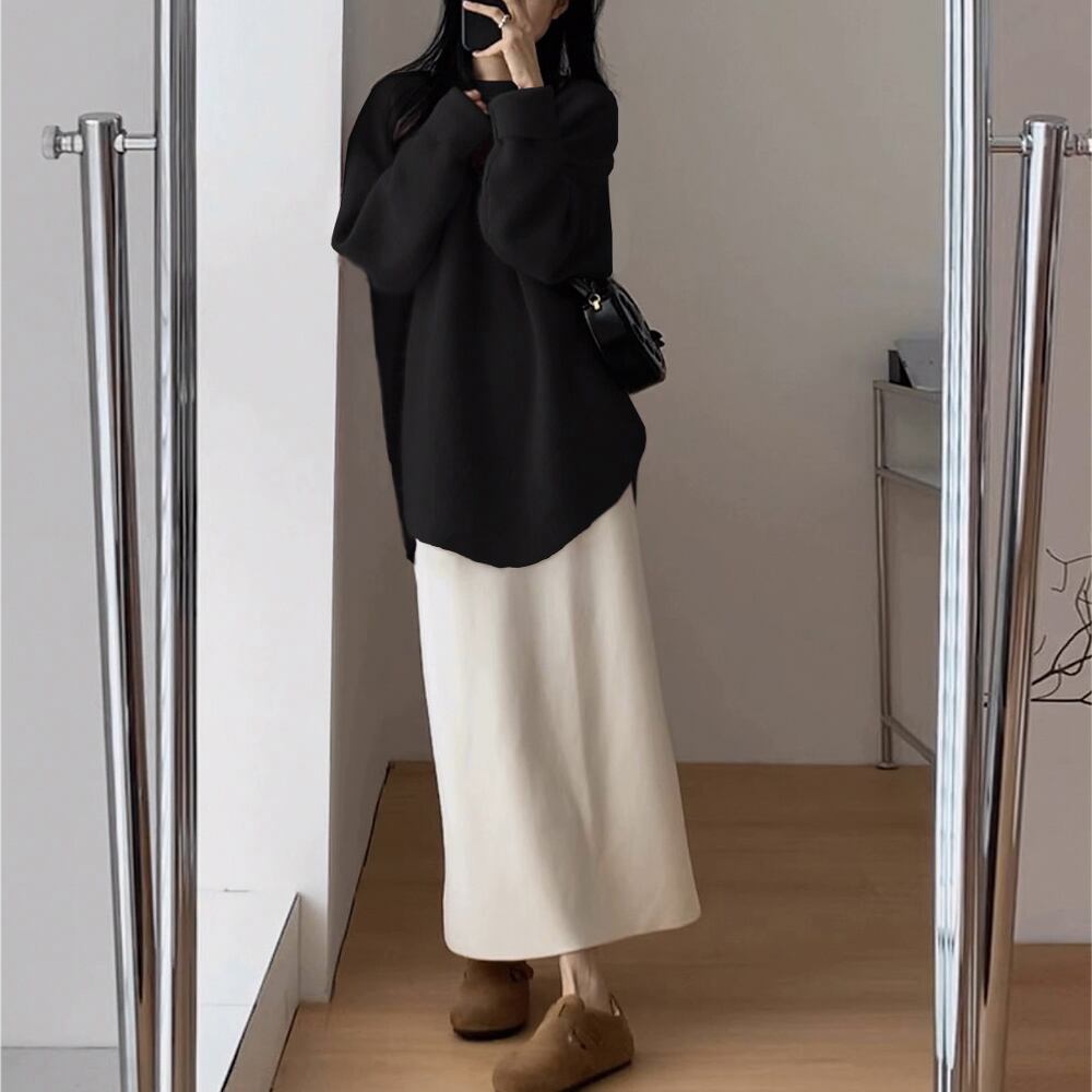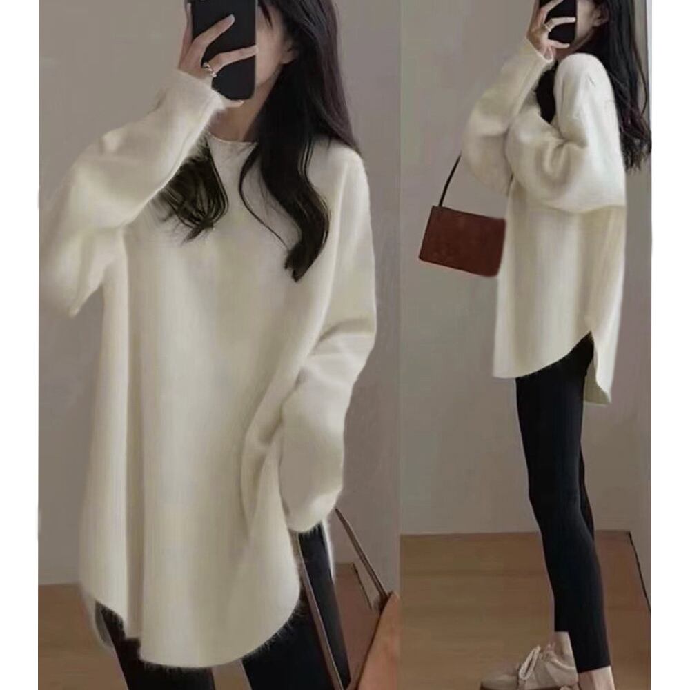 レディース おしゃれニットカットソー 長袖ゆったり ニットプルオーバー 体型カバー韓国セーター 着やせ 無地ラウンドヘム