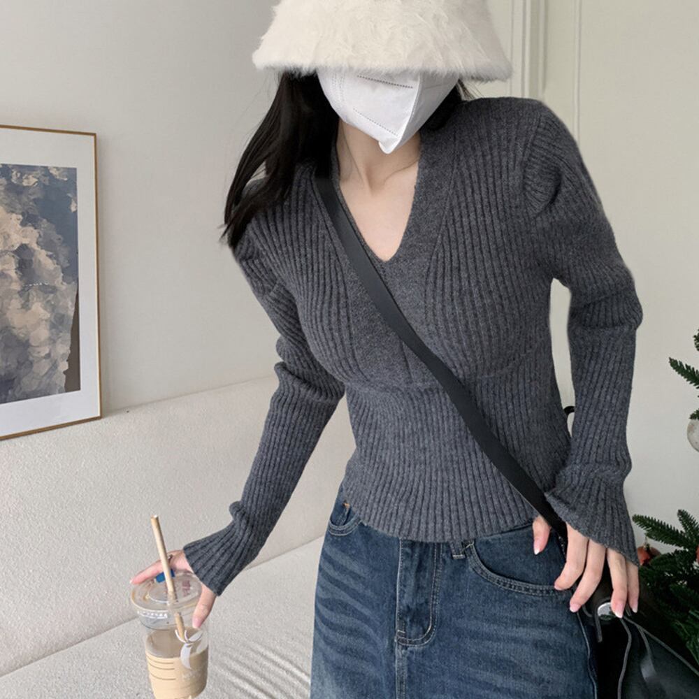 ギャザーをクシュっと寄せたパフ袖がキュート、Vネックでデコルテラインを美しくすっきり見せ、リブ仕様の縦ラインは華奢感を強調