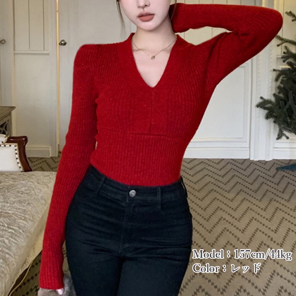 リブニットトップス 長袖 パフスリーブ 細見え ニットセーター 大人セクシー きれいめニットカットソー 無地 フェミニン