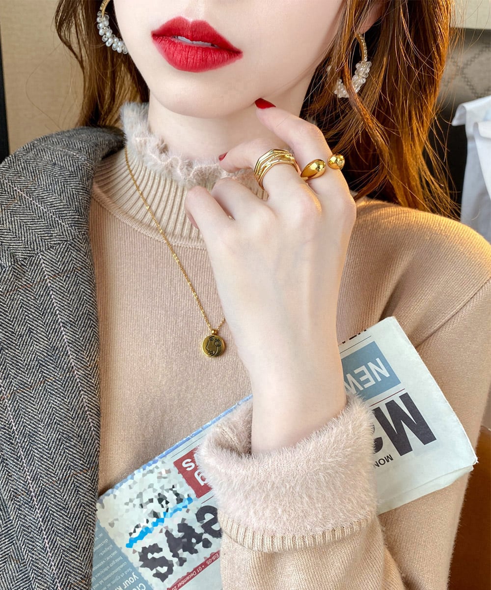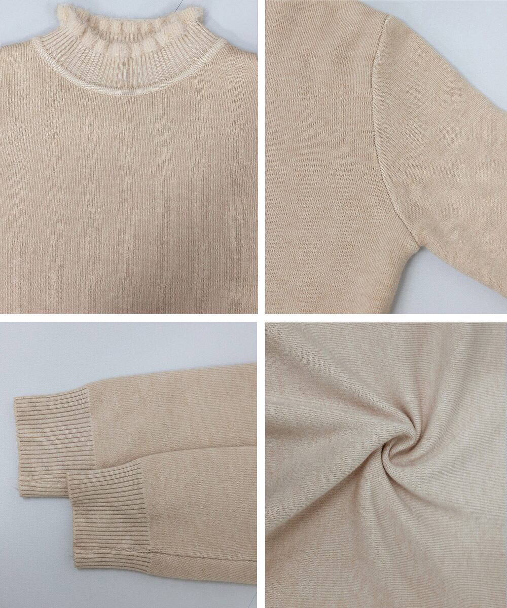 レディース メロウフリル 裏ファー 暖かいインナー 厚手 ニットソー きれいめ モックネックニットセーター 着やせ 韓国