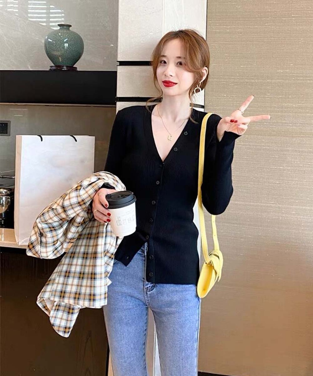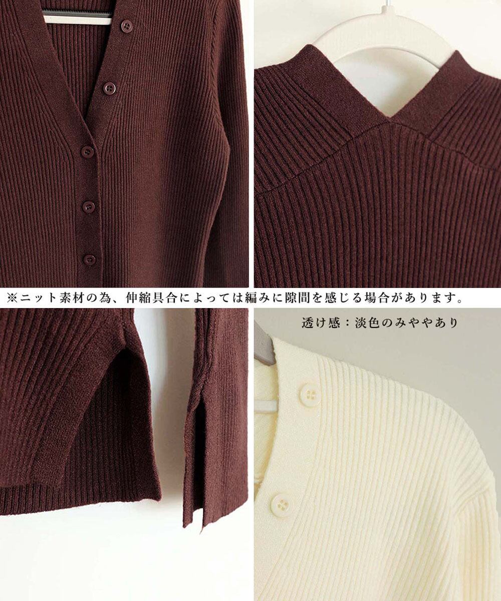 Vネック ボタンリブニット トップス