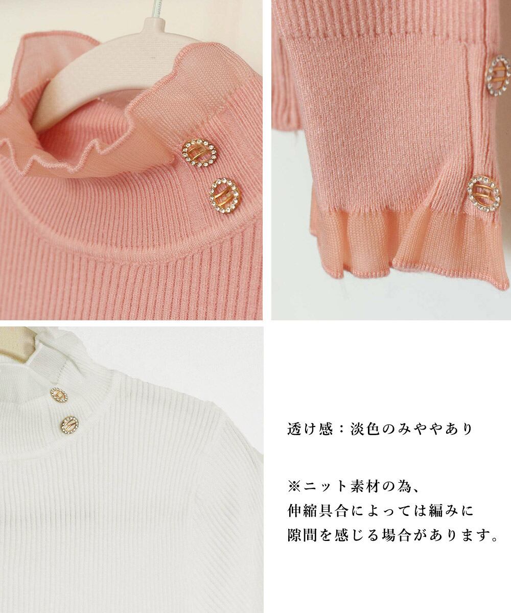 襟元と袖口にキラッと輝くボタンとフリルが可愛いプチハイネックリブニット