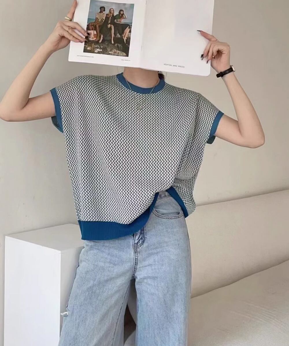 ノースリーブニットトップス きれいめ 柄ニットTシャツ ゆったり 体型カバー 半袖春夏トップス 丸首 薄手ニットソー韓国