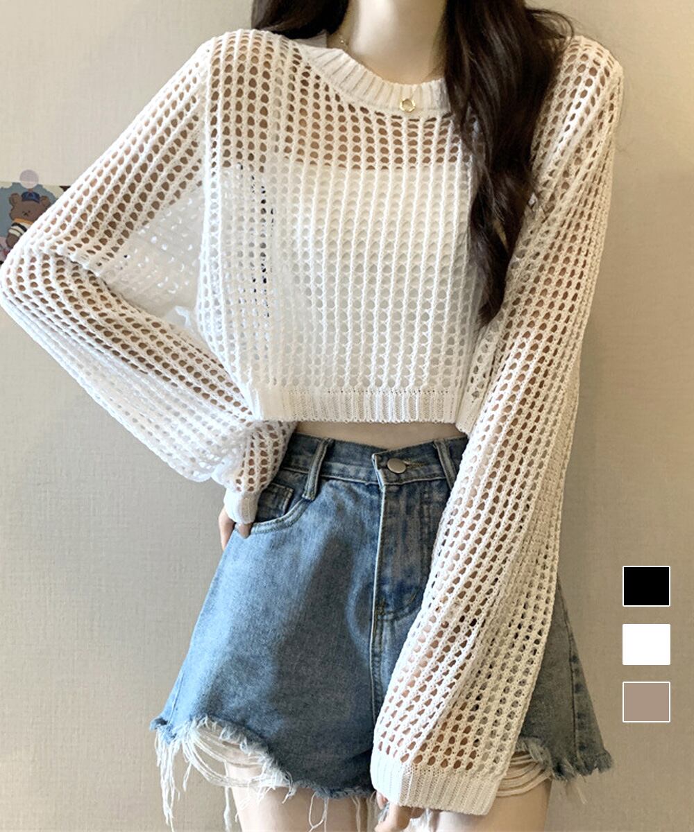 トレンドのメッシュ編みの長袖トップス。