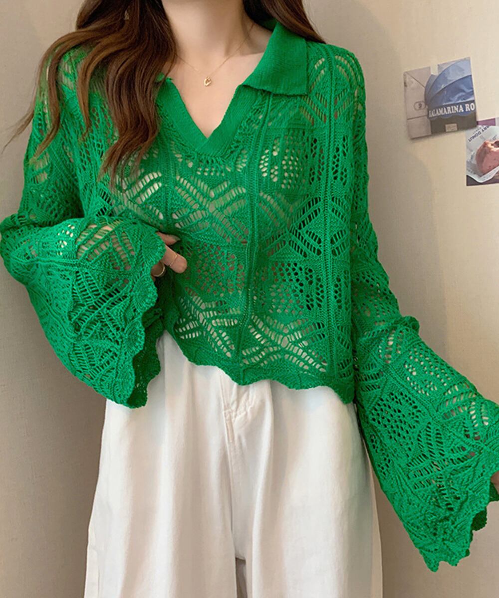 レディース クロシェ編み ポロニット 長袖ショート丈ニット オープンカラーメッシュ編み 襟付きニットプルオーバー春夏秋服