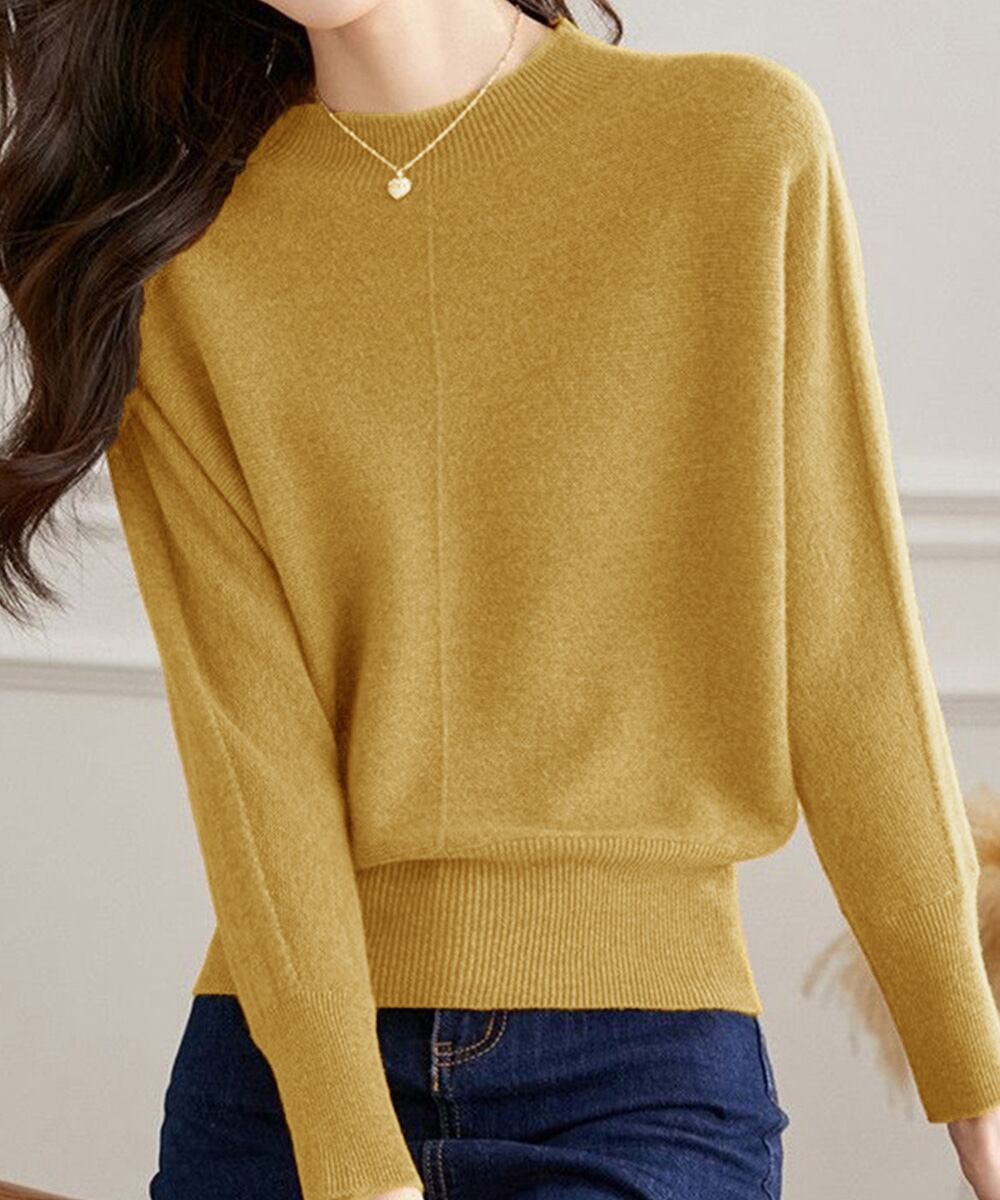 体のラインをきれいに魅せ、女性らしさを際立たせるプチハイネックニットセーター