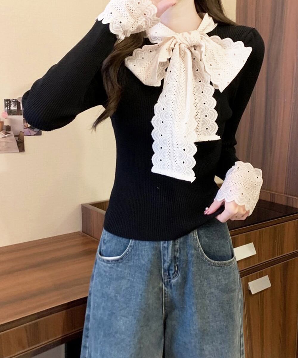 刺しゅうレースのボウタイデザインで可愛さをUPするニットトップス