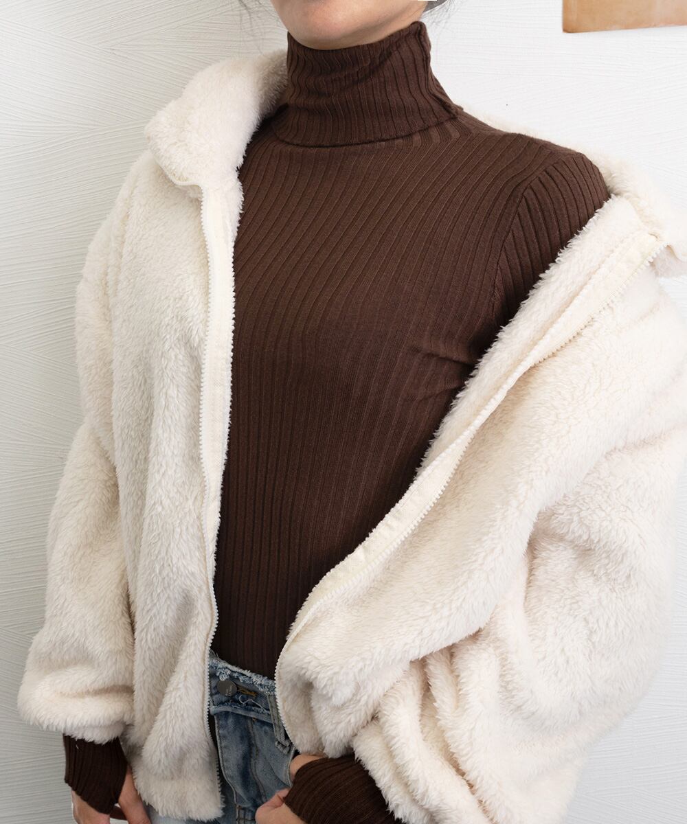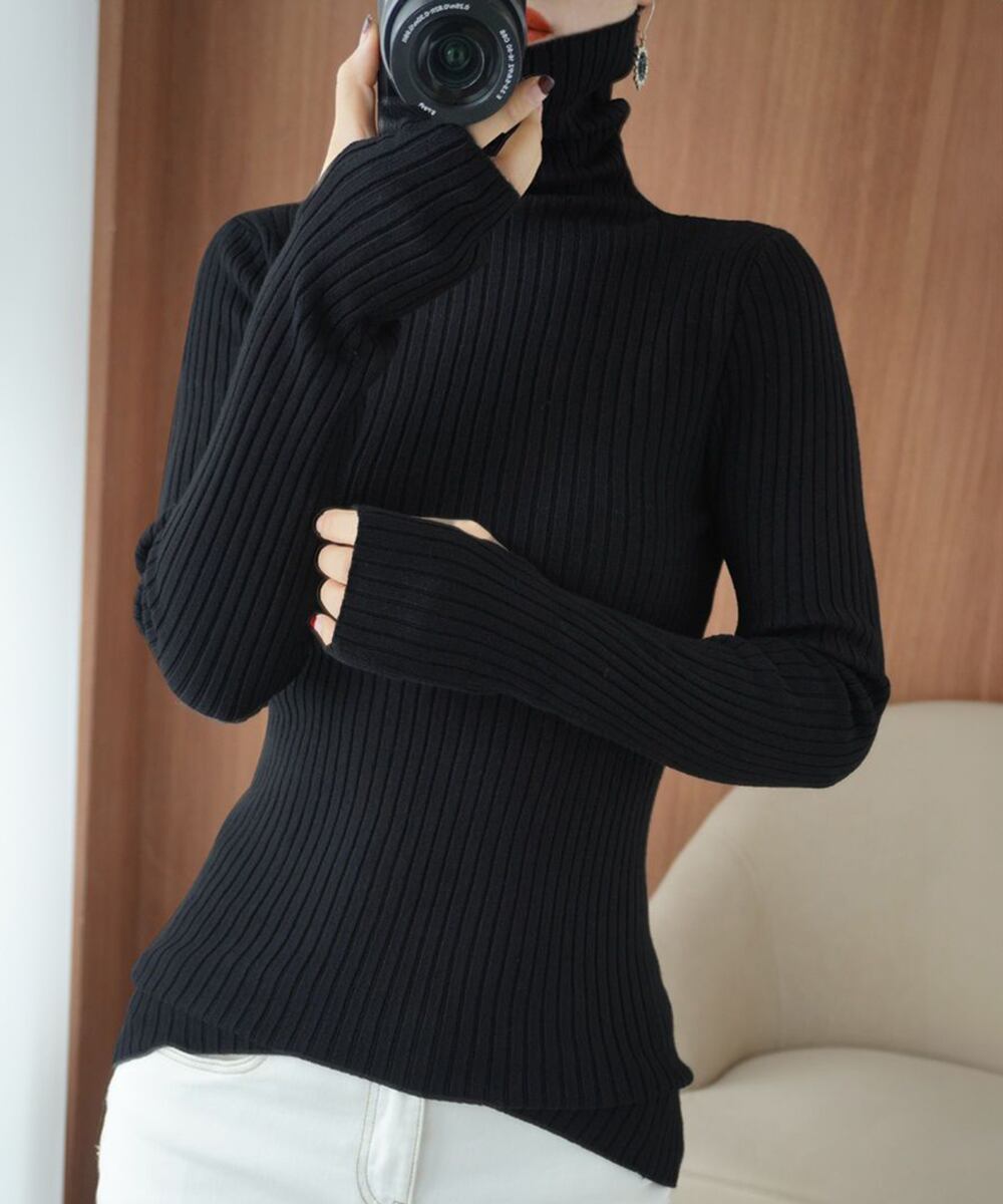 トレンド感たっぷりの指穴付きハイネックニットトップスです
