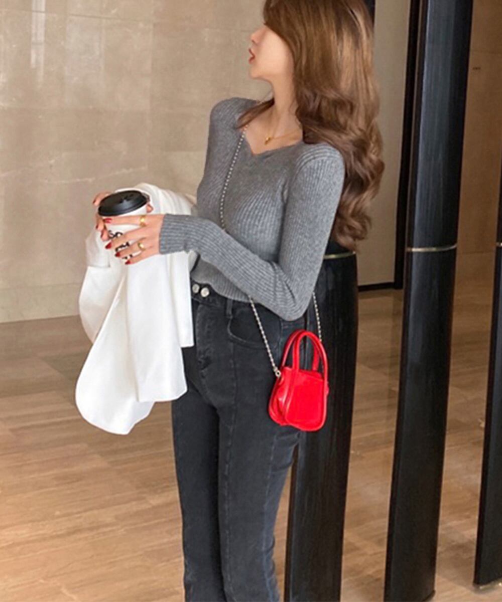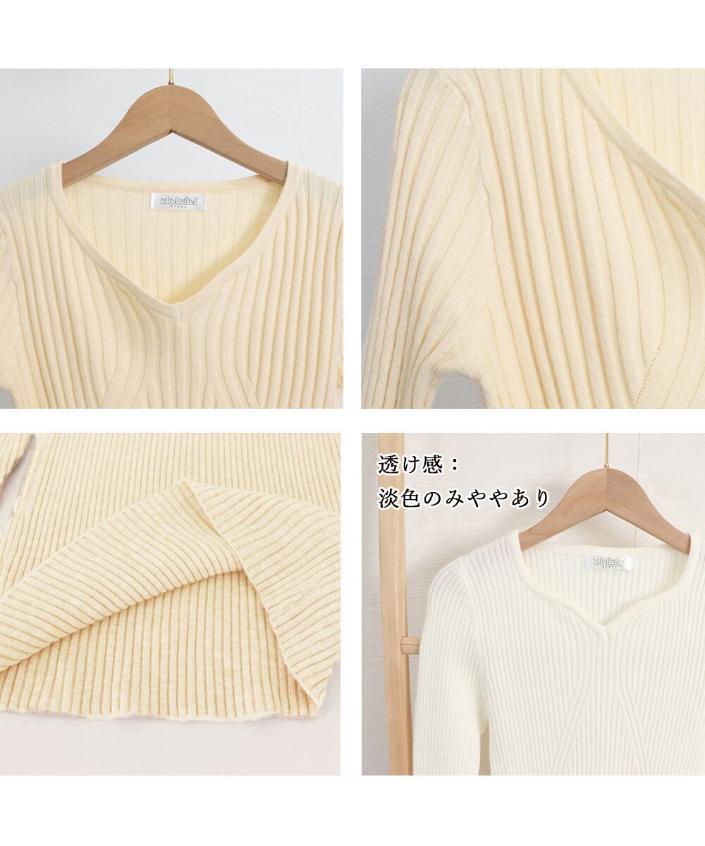 ハートネックで首元がすっきり綺麗に見える長袖タイトニットトップス