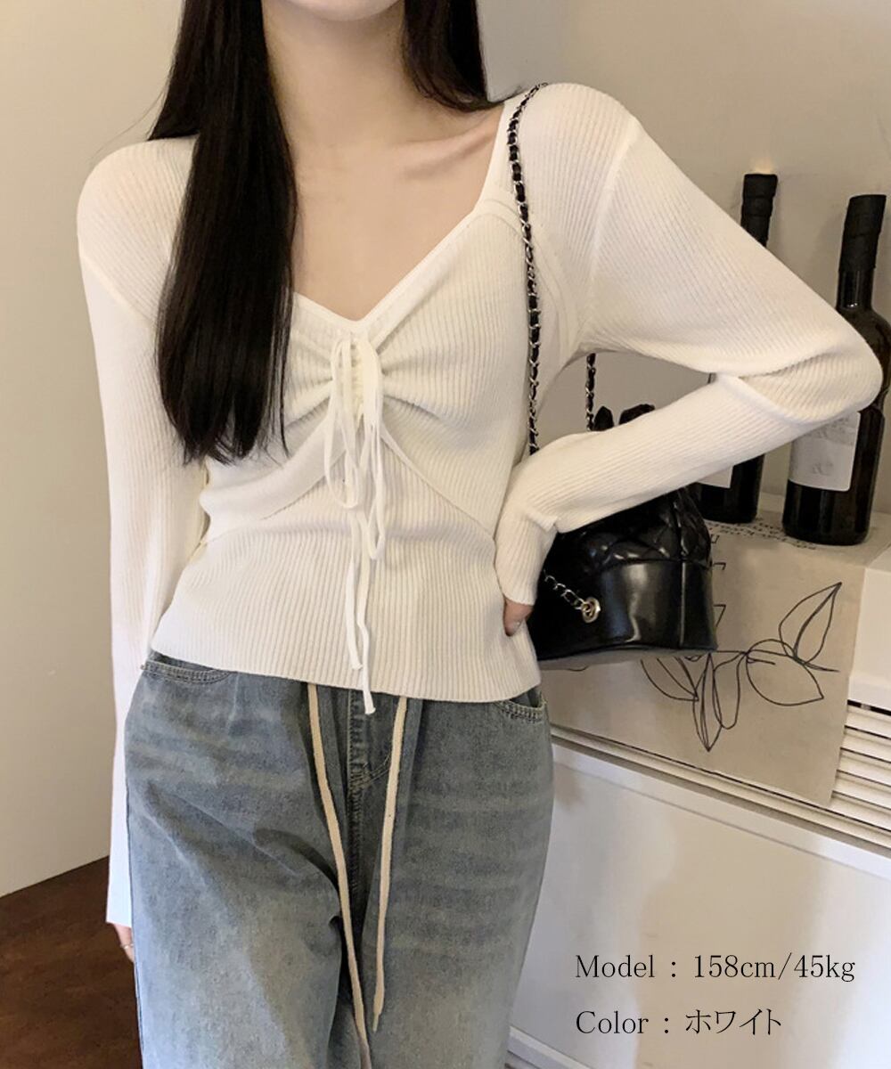 フロントの大きなリボンデザインとペンタゴンネックがお洒落なニットトップスです