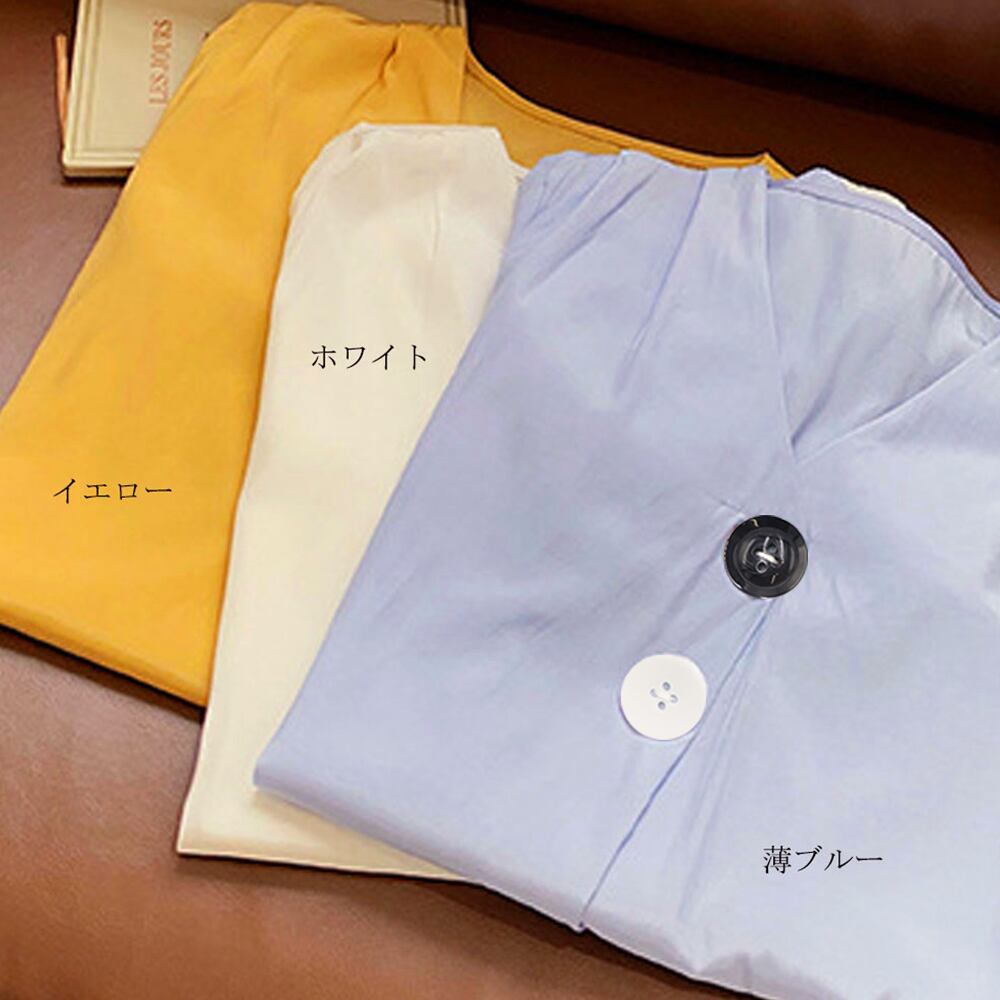 大きな丸ボタンがアクセント、キュートさが増すVネックシャツです