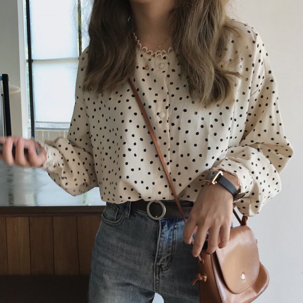 着るだけで女性らしく可愛い印象を与えてくれるドット柄ブラウスです