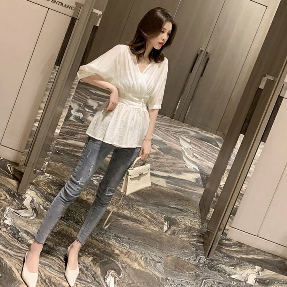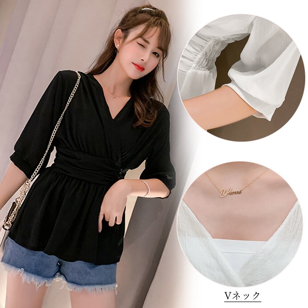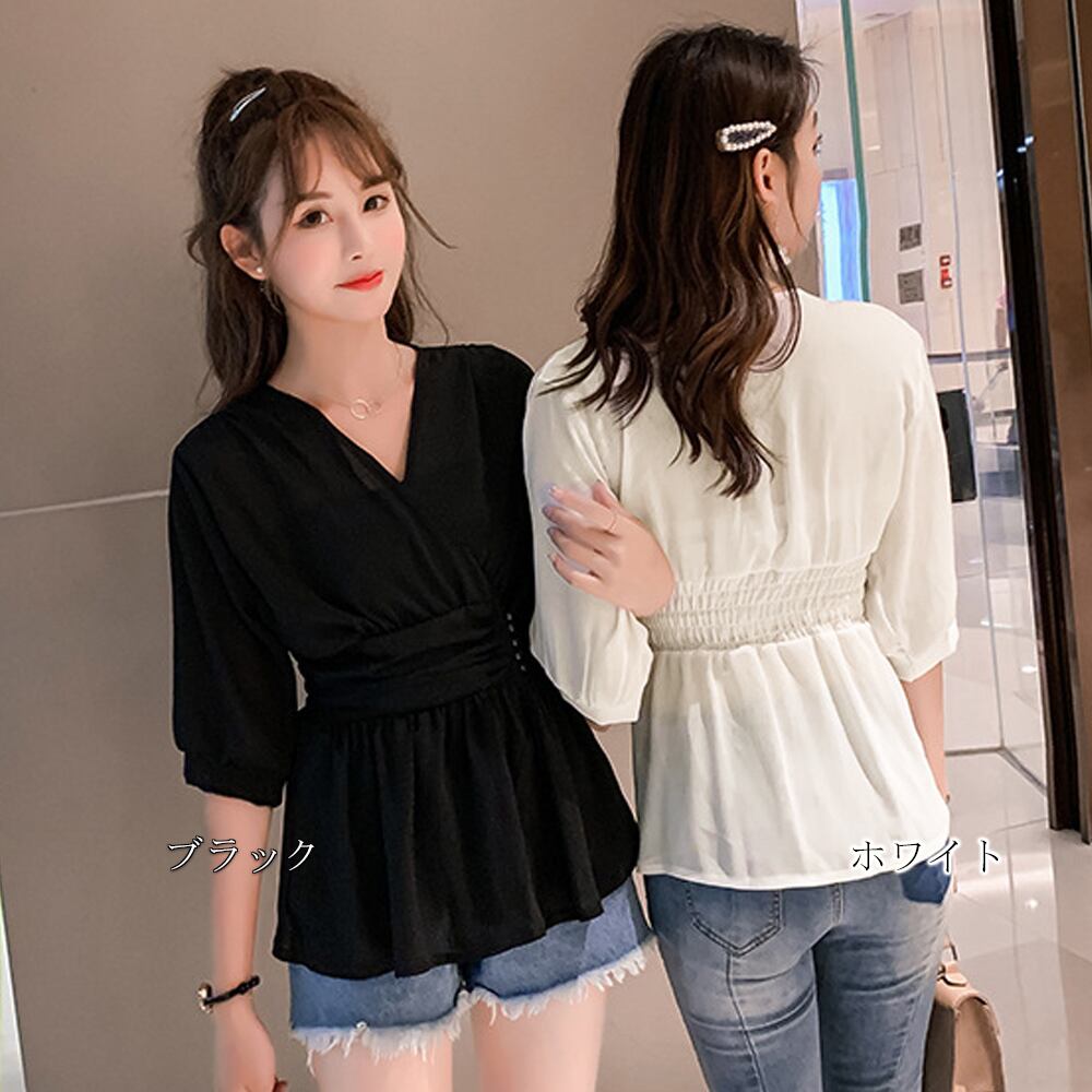 使い勝手の良い白と黒2カラーを展開し、ウエストを細く見せるペプラムブラウスです