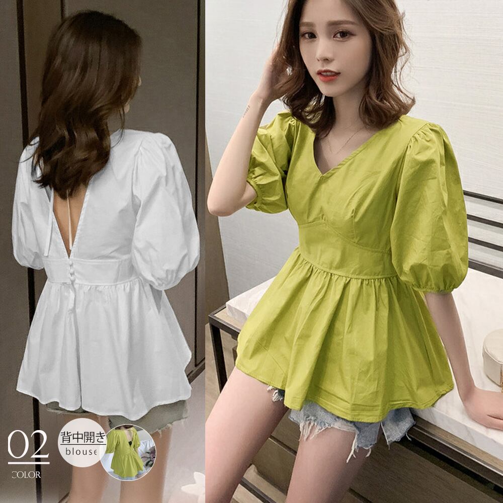 Vネック へプラム ブラウス レディース パフスリーブ トップス 背中あき