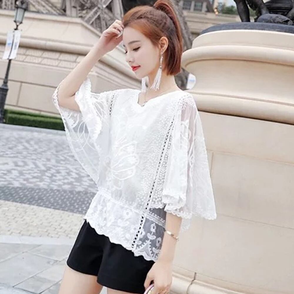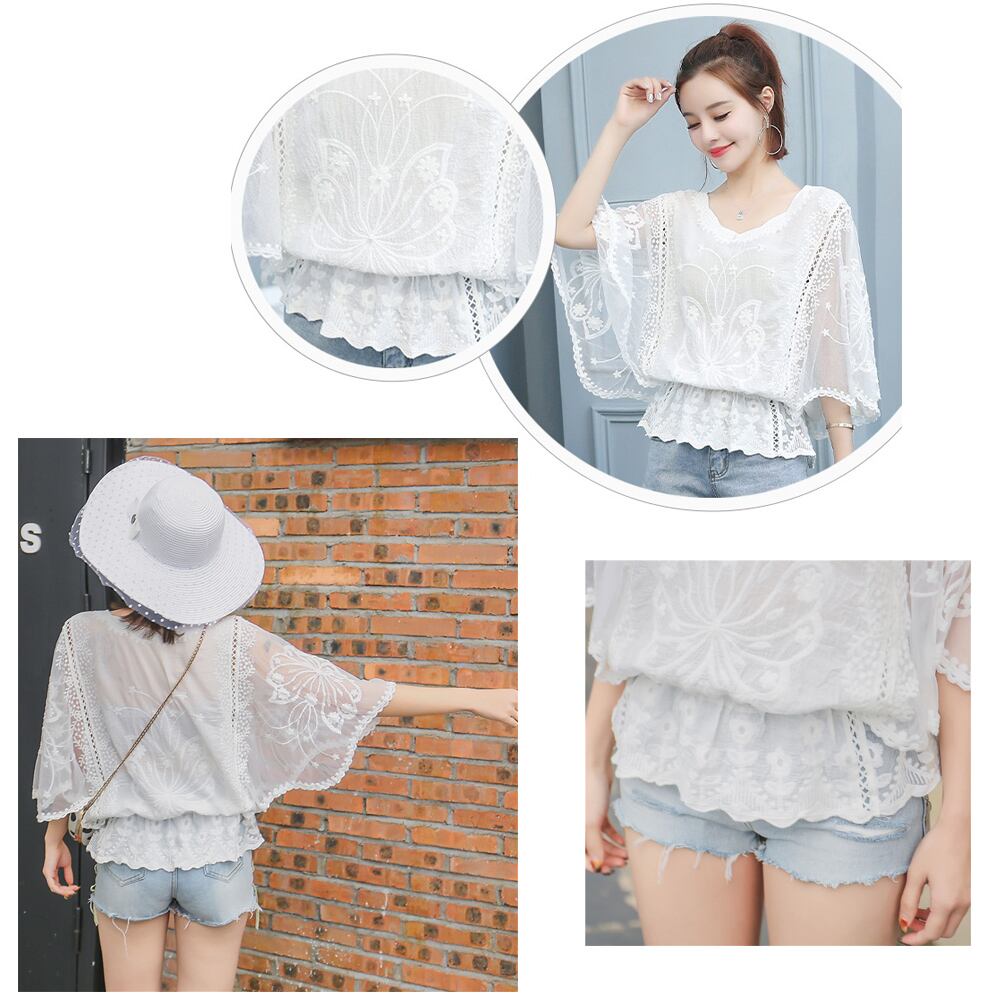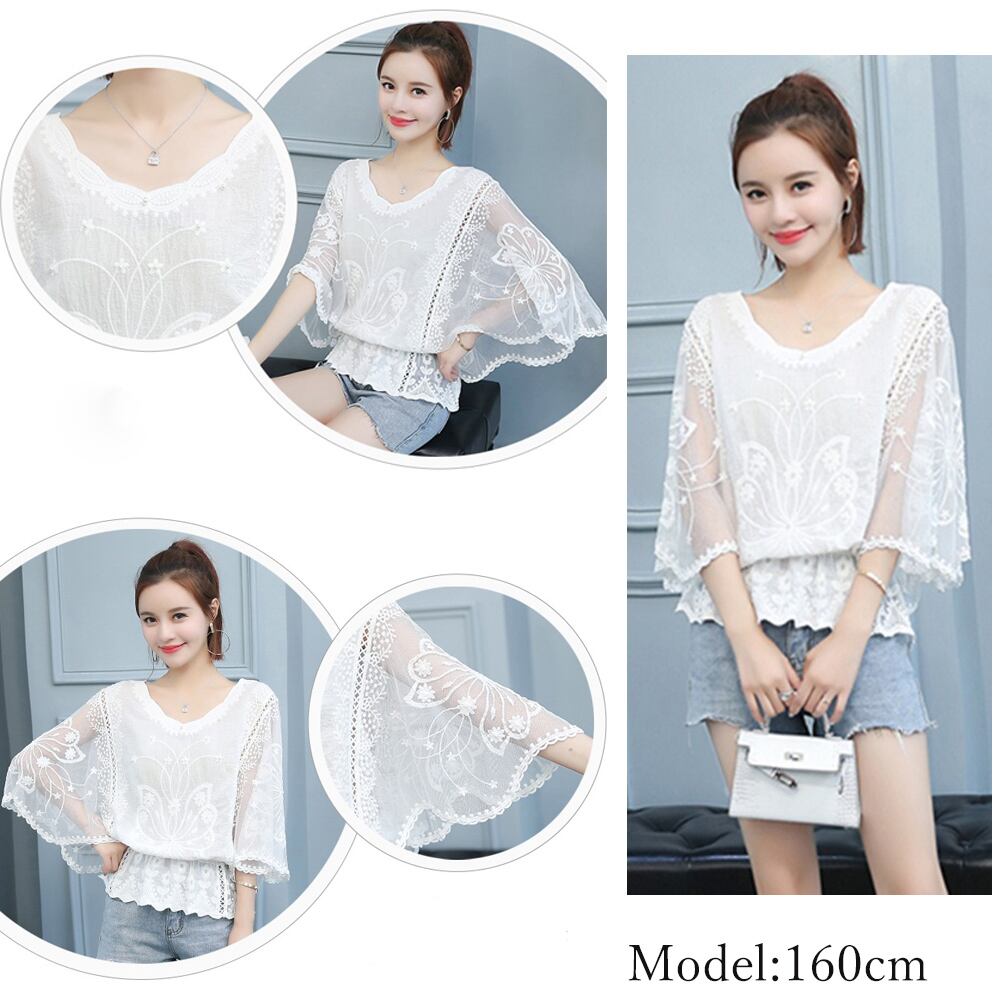 ドルマンスリーブ 白シャツ 花レース ギャザー ブラウス 体型カバー 刺繍
