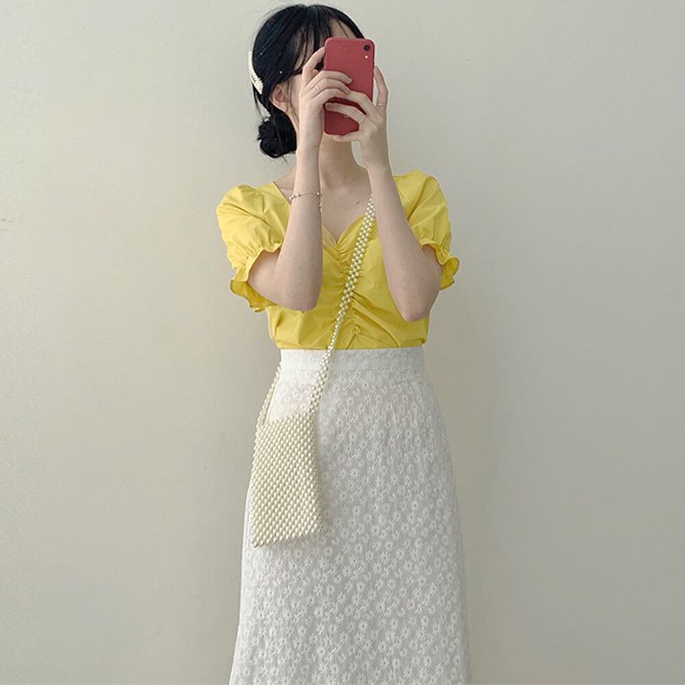 Vネック ギャザーブラウス レディース 半袖 トップス パフスリーブ
