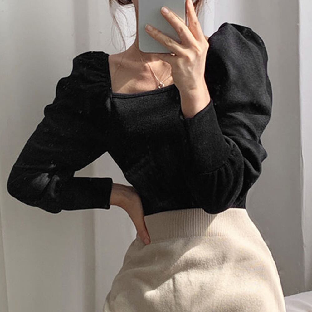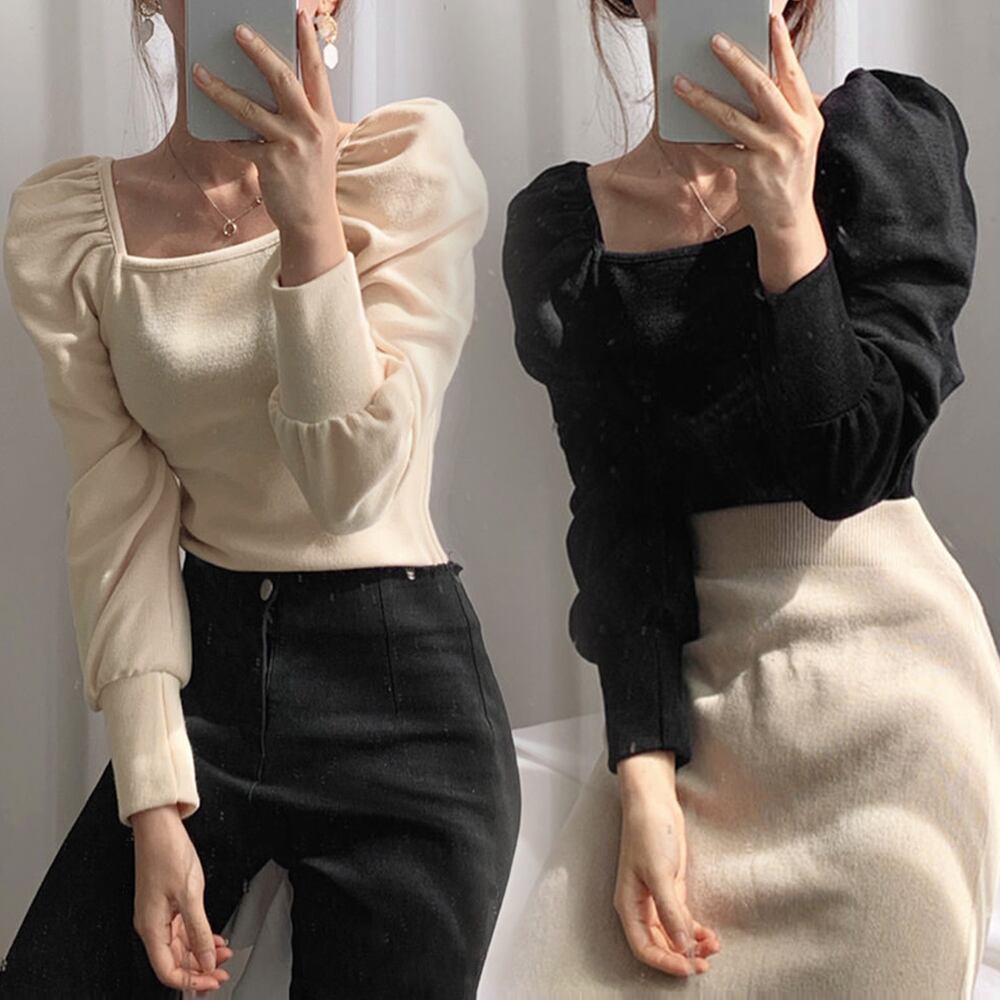 スクエアネック ニットトップス レディース 長袖 パフスリーブ ニットセーター