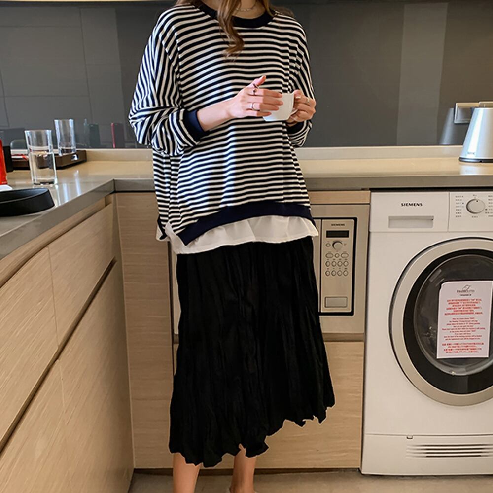 ボーダー ニットトップス レディース ラウンドネック レイヤード風
