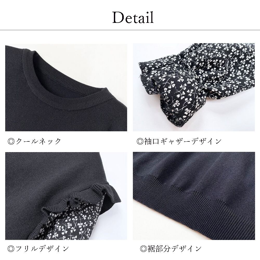 細かい花柄のボリュームある袖がドッキングしたニットプルオーバー