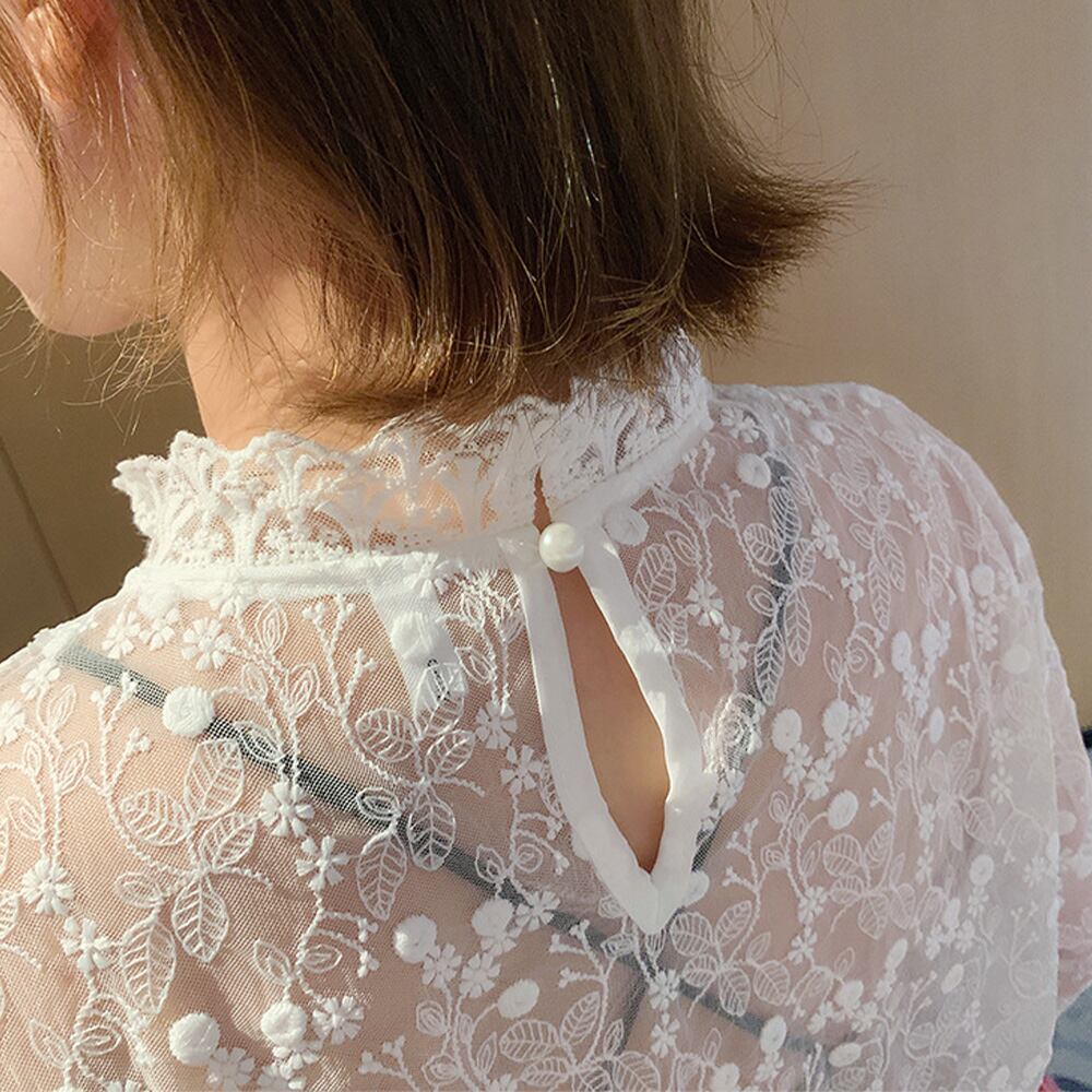 ふんわり着こなせる質感で女性らしさを感じるプチハイネックレースブラウス
