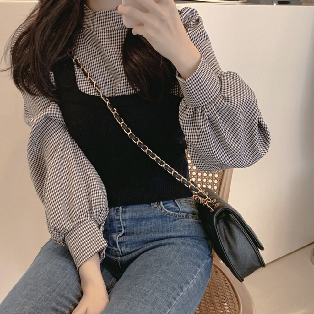 ニットキャミソール ブラウス2点セット レディース チェック柄 長袖シャツ