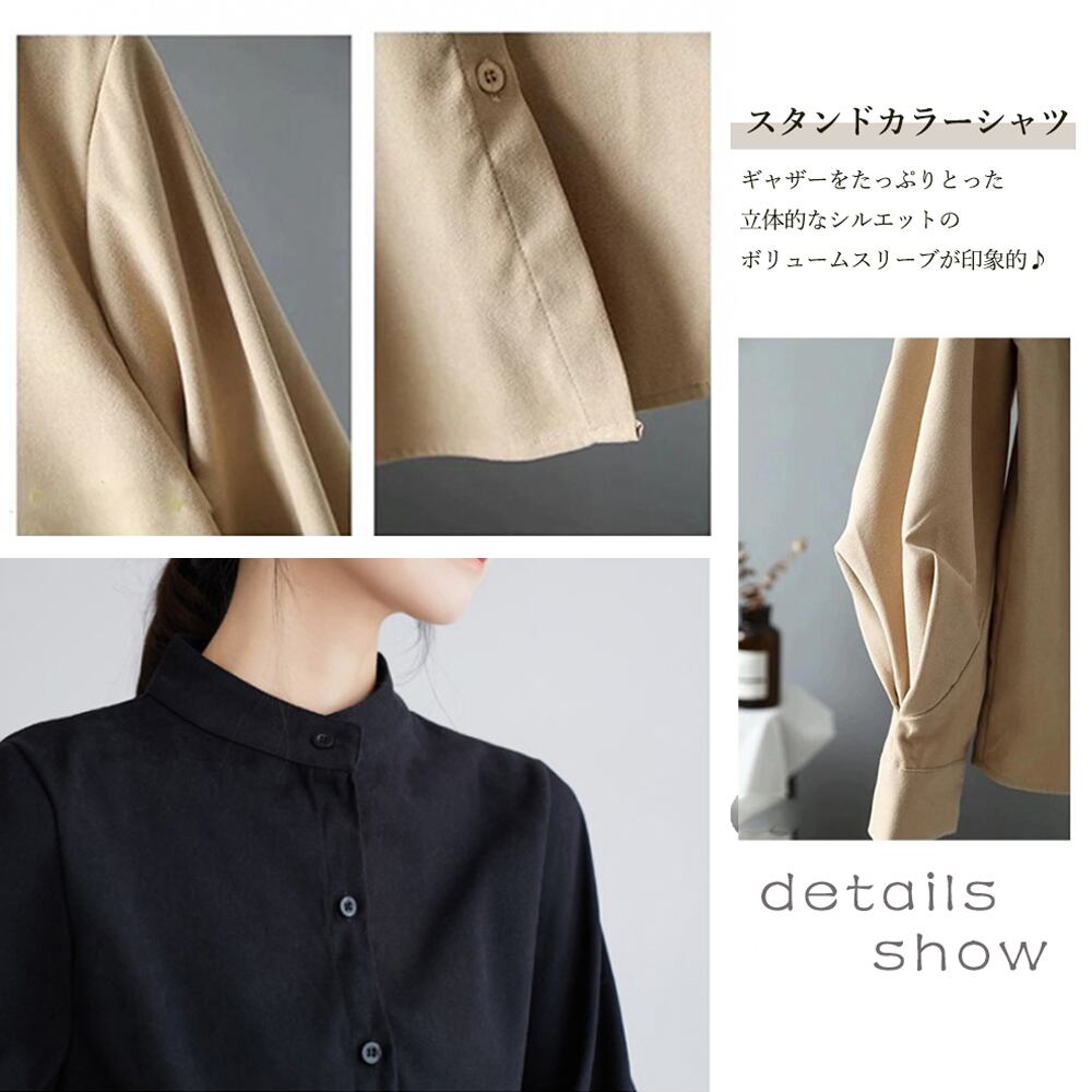 レディース スタンドカラーブラウス ハンドカラー 韓国 ボリューム 長袖シャツ 着やせ 大人カジュアル無地30代40代