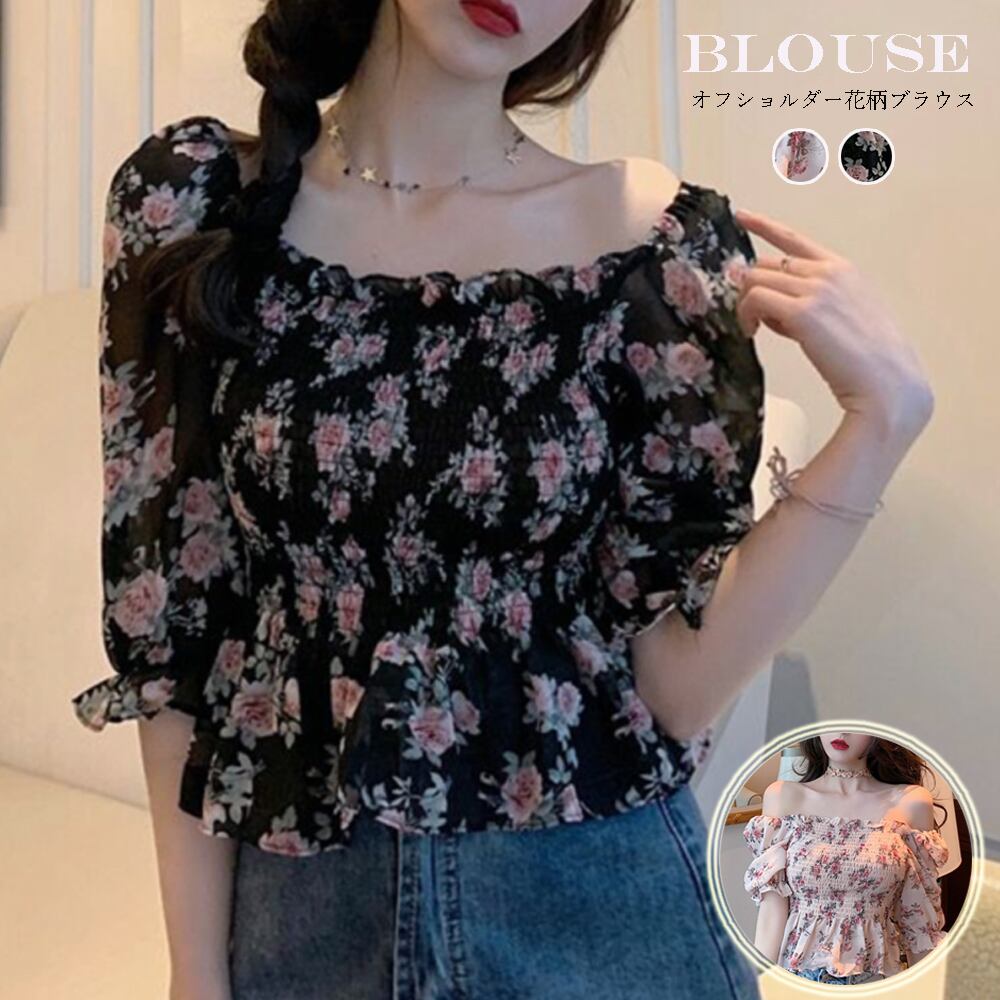 花柄 ブラウス レディース スクエアネック シャーリング オフショルダー