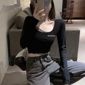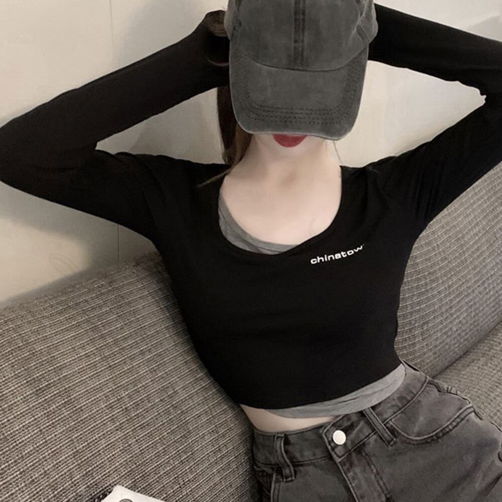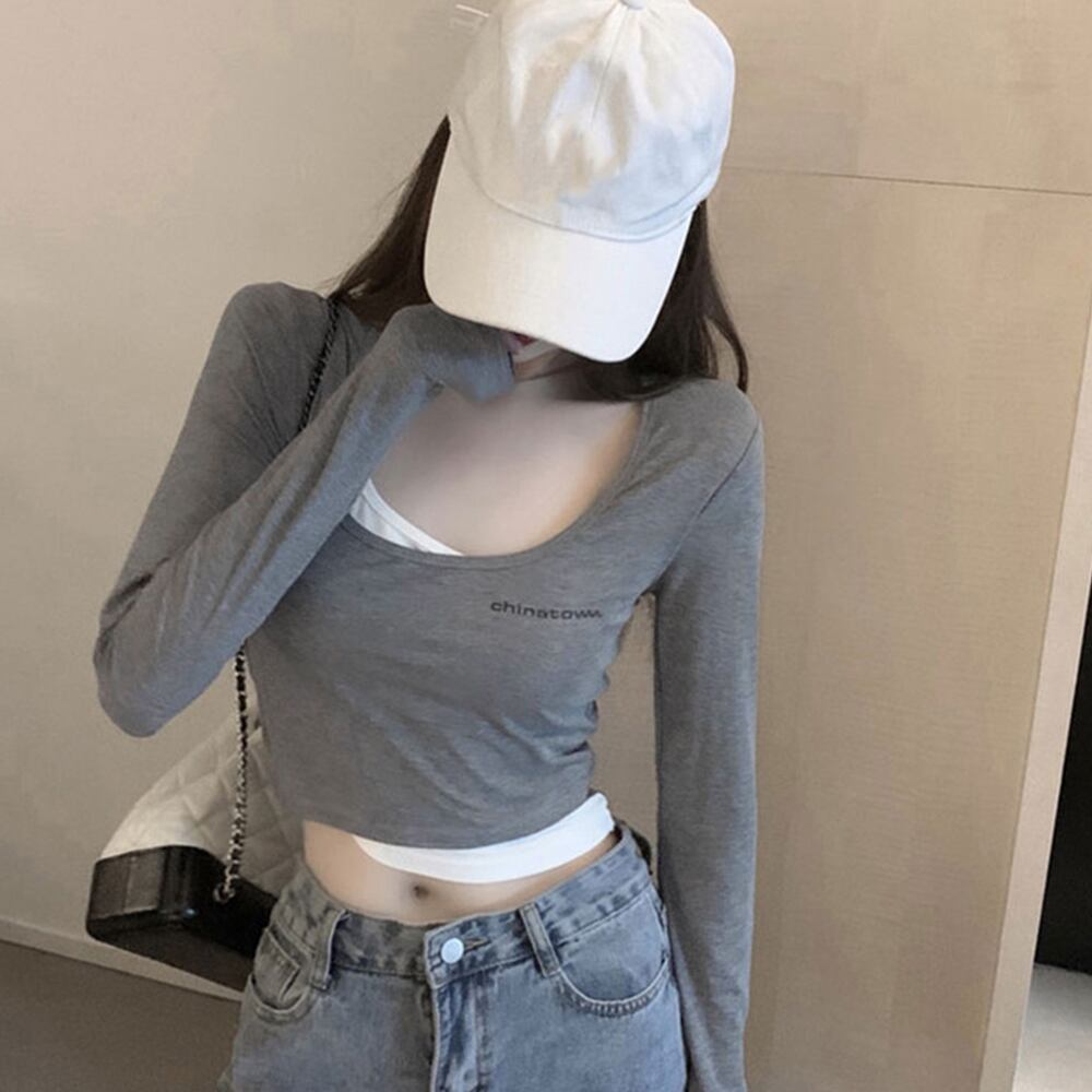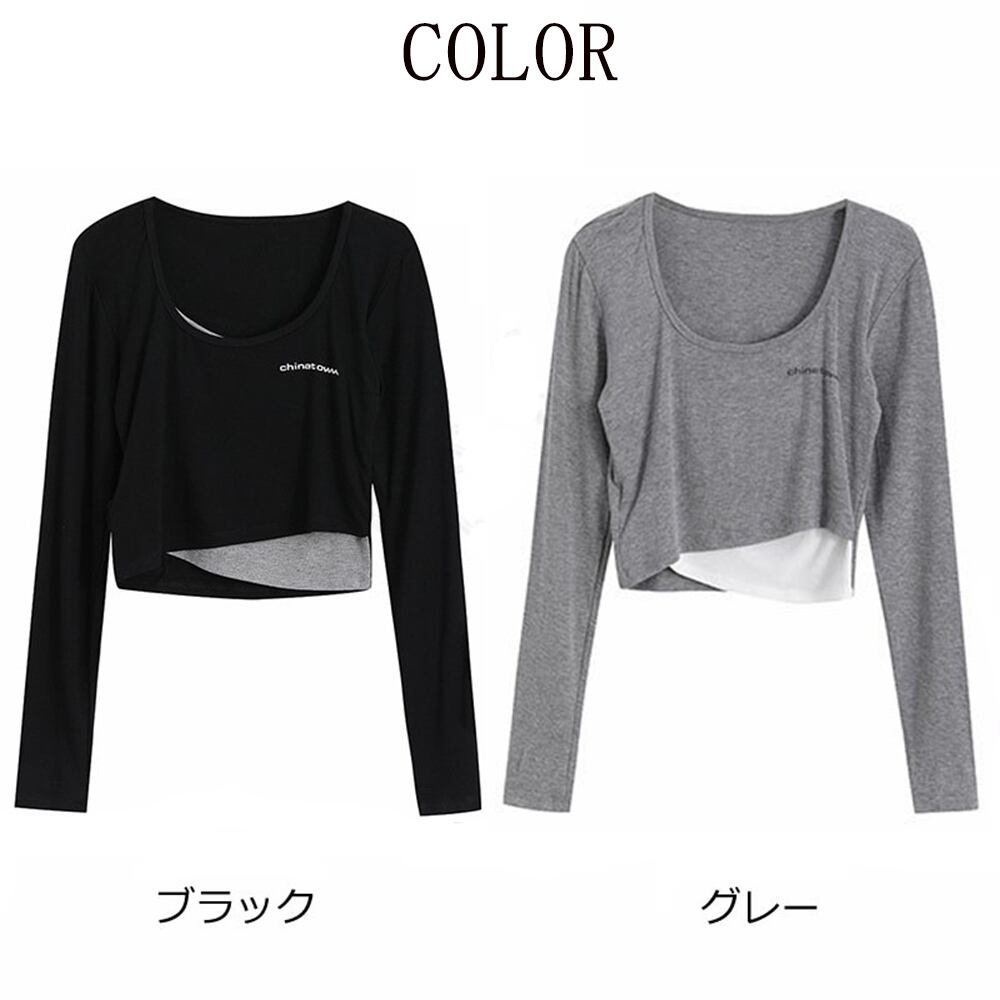 Tシャツ レディース 無地 長袖 ショート丈 トップス カジュアル 重ね着風