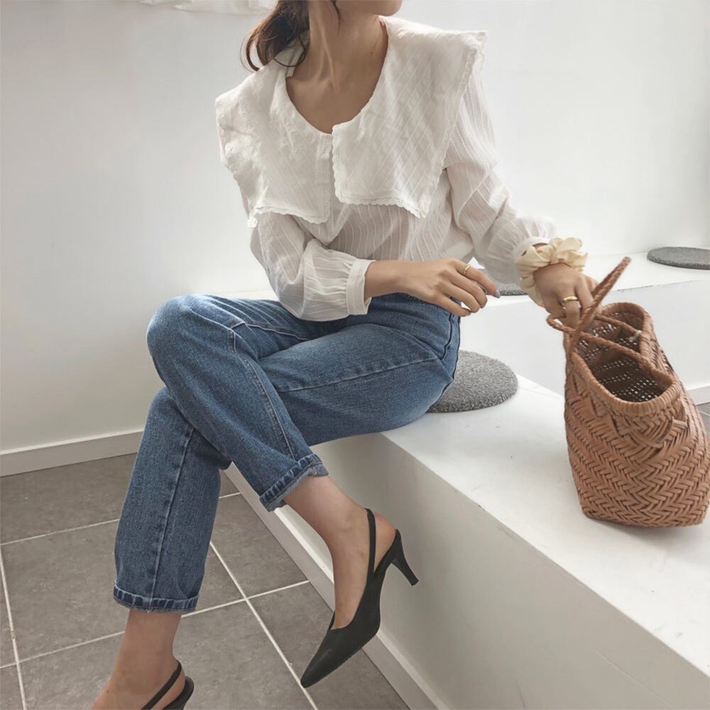 柔らかく優しい素材感と大き目の襟が特徴的なブラウス