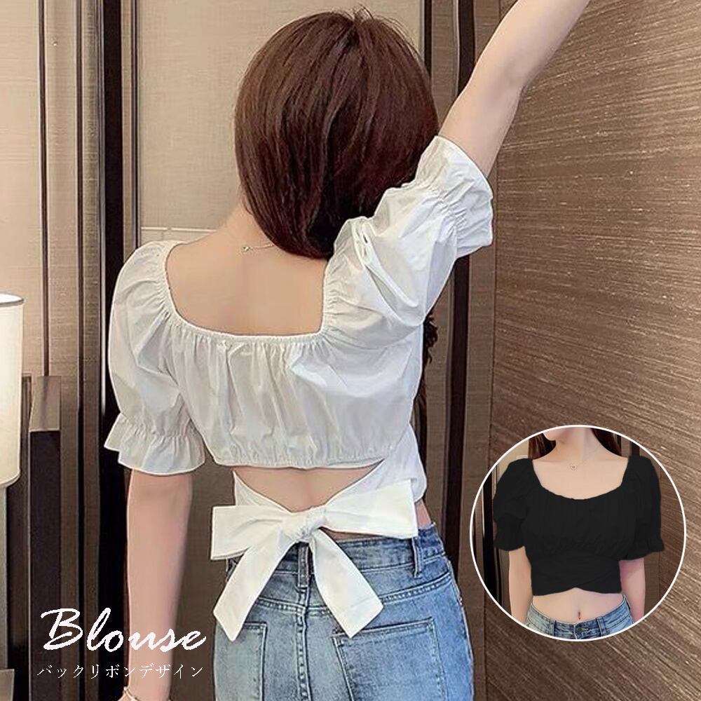 オープンバック仕様にリボン結びデザインがセクシーで可愛い半袖トップス