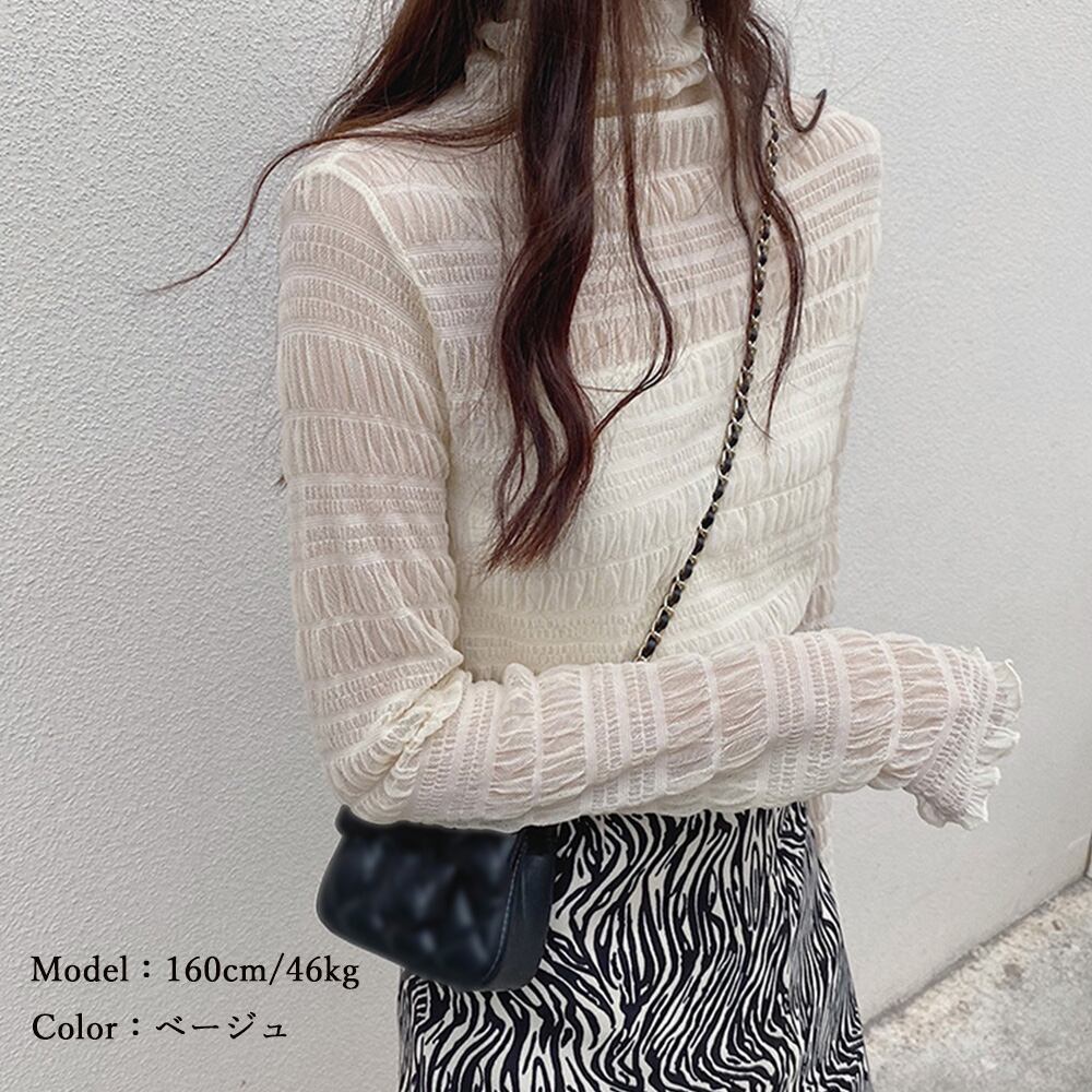 シアーギャザー カットソー ベーシック フリル ハイネック 透け感 おしゃれ 大人かわいい オフィスカジュアル 薄手 セクシーフェミニン 韓国ファッション 春トップス 重ね着