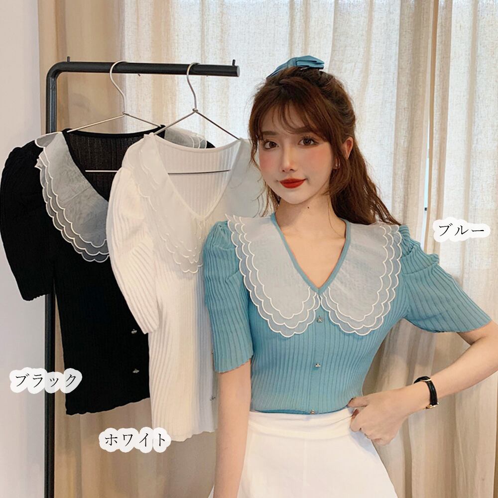 カットソー Vネック レディース チュールフリル襟 ギャザー 飾りボタン セーター リブニット 夏新作 ショート丈 フェミニン 可愛い