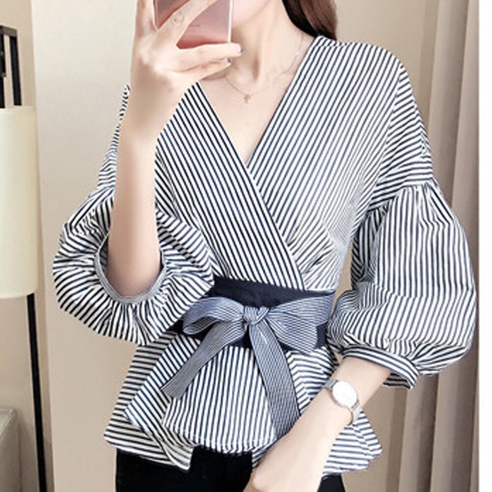 ブラウス リボン 半袖 春夏 バックシャン トップス 韓国風 バックボタン ストライプ柄シャツ 襟なし 着やせ Vネックシャツ