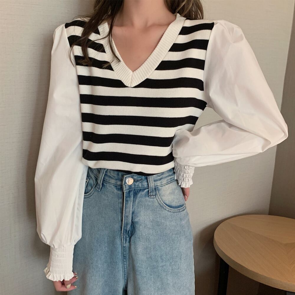 レディース シャツドッキング ニットブラウス 韓国風 シンプルトップス Vネック 大人可愛い