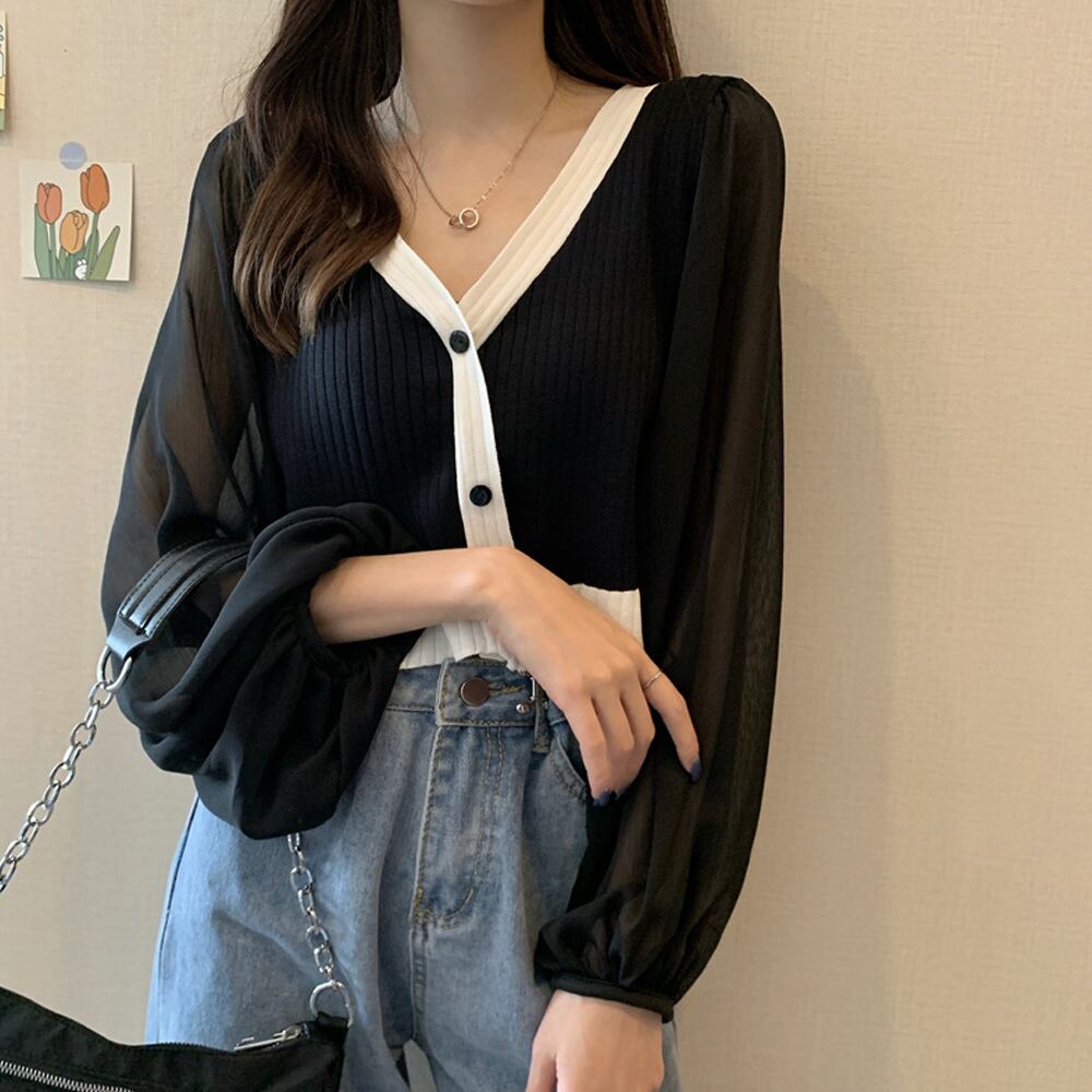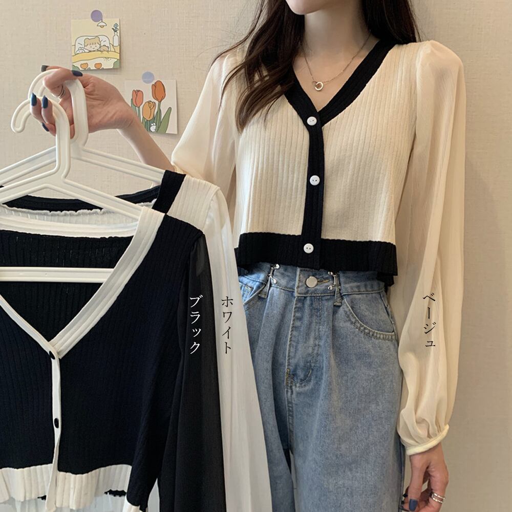 シフォン袖ニットカーディガン 韓国風