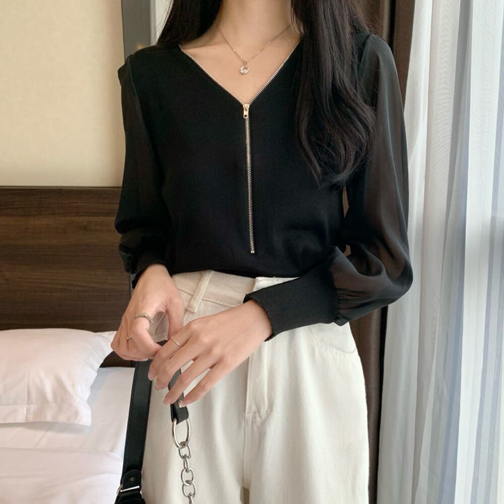 レイヤードトップス レディース フロントジップ シャツブラウス きれいめ 韓国風 ドッキングトップス お洒落