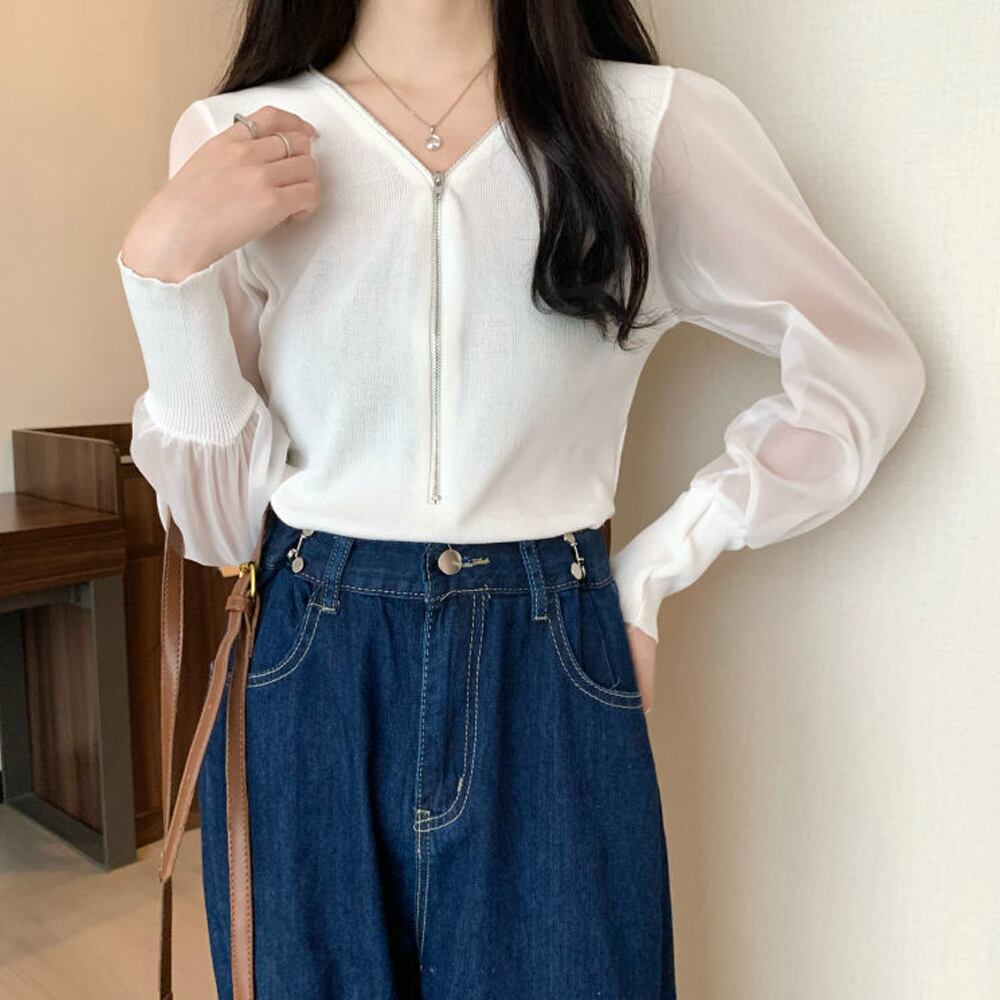袖透け感 トップス vネック ブラウス 長袖 カジュアル