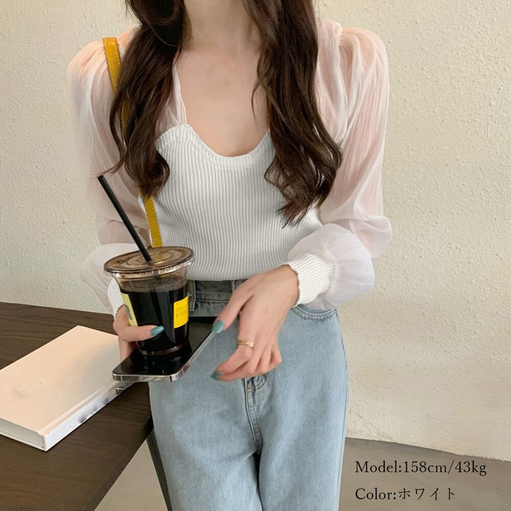 シフォンの切り替えでデコルテ、袖や背中見せるリブニットトップス