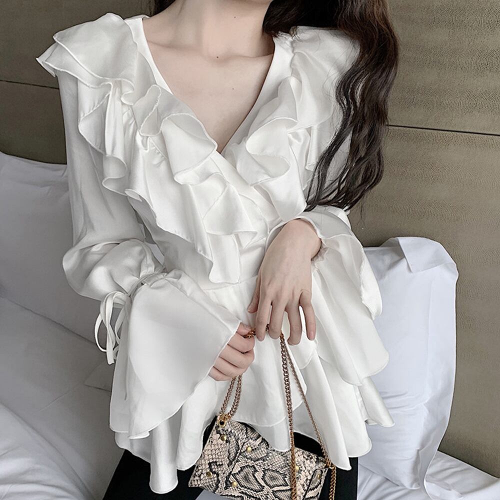 花満開のようなフリルを襟元にあしらったゴージャスなロングスリーブブラウス