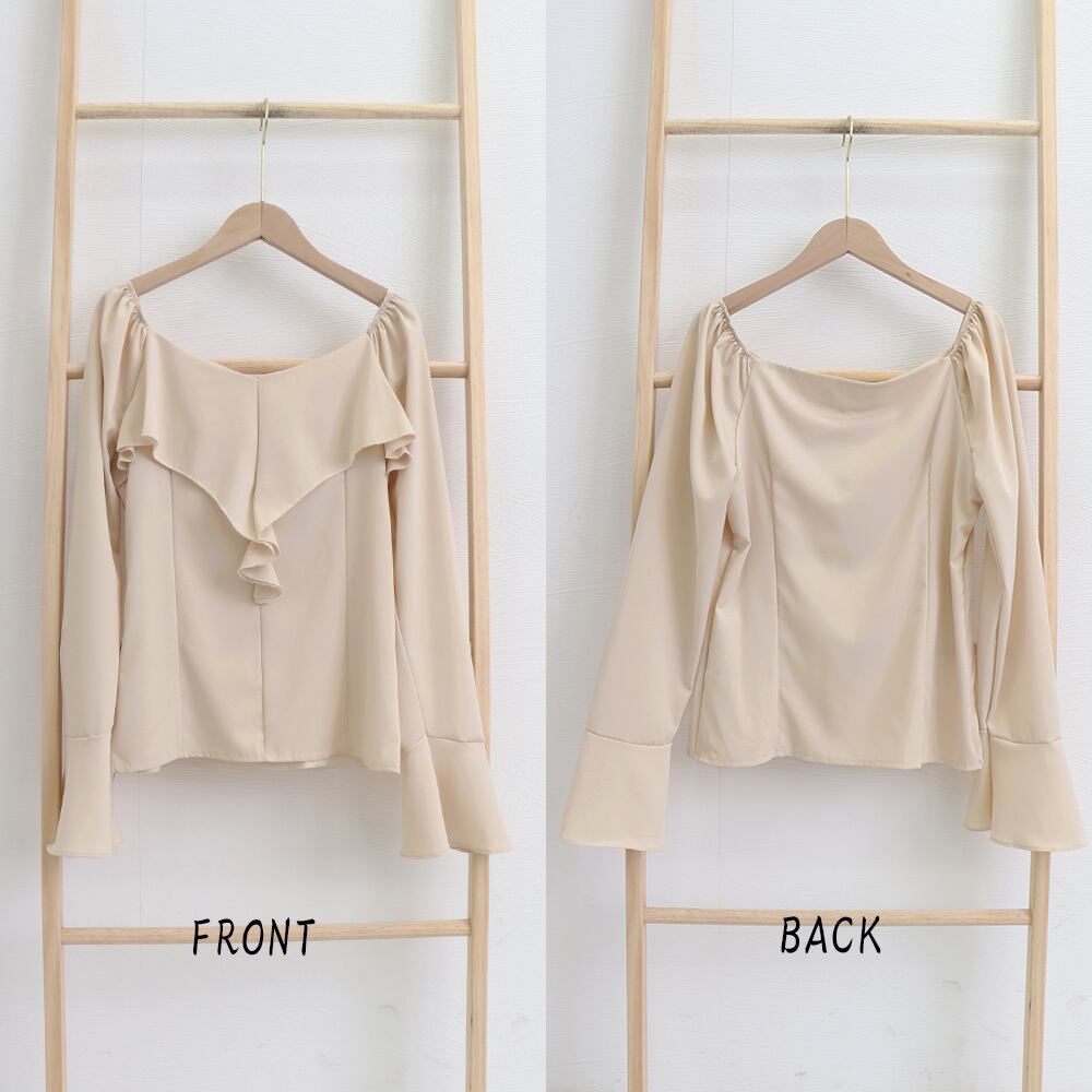 大きめのラッフル襟でデコルテを美しく魅せ、1枚でサマになるとろみ素材の上品清楚系ブラウス