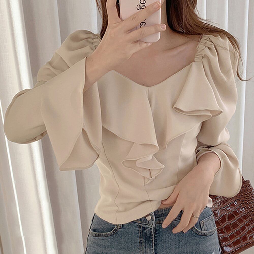 レディース ラッフルカラー とろみブラウス パフスリーブ トップス フレア袖 おしゃれ ブラウス きれいめ 春先行 人気