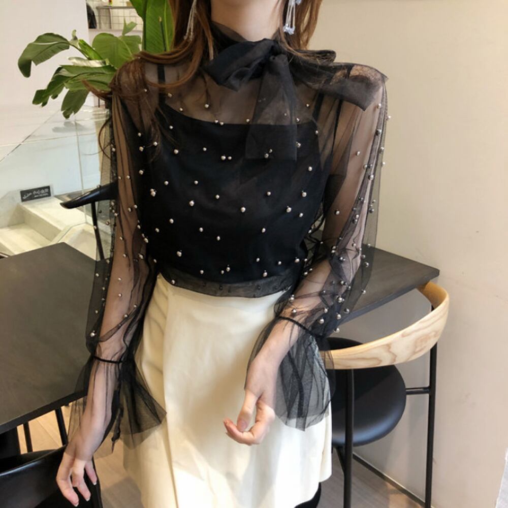 韓国ファッション レディース 前後2way リボンタイブラウス 長袖 大人可愛い キャミソール 2点セット 透け感春服