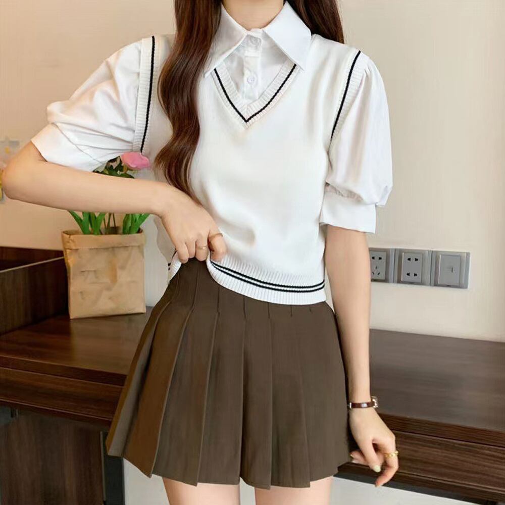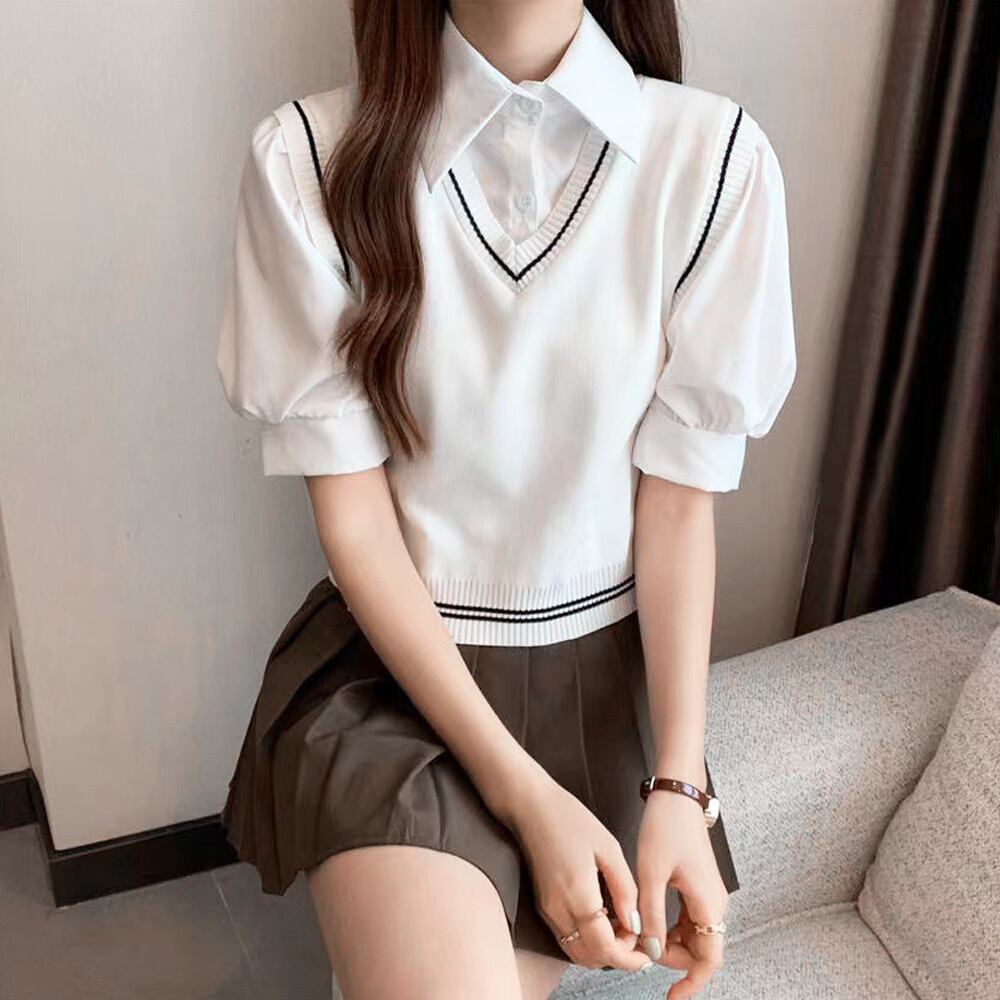 ニットトップス レイヤード風 ショート丈 重ね着風 リブニット 襟付き 大人可愛い Vネック 半袖