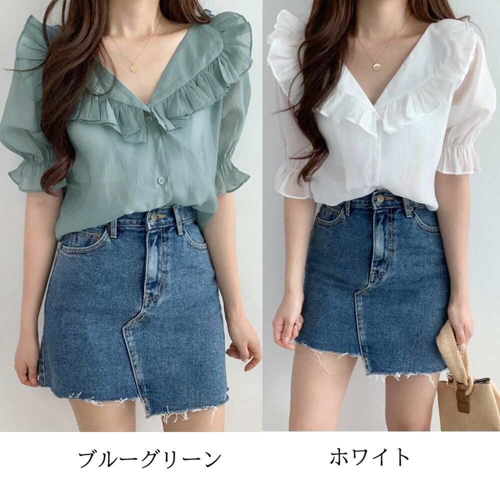 シャツブラウス レディース フリルブラウス 半袖 通勤 可愛い 大人こなれ感 薄手 無地 OL おしゃれ フェミニン韓国