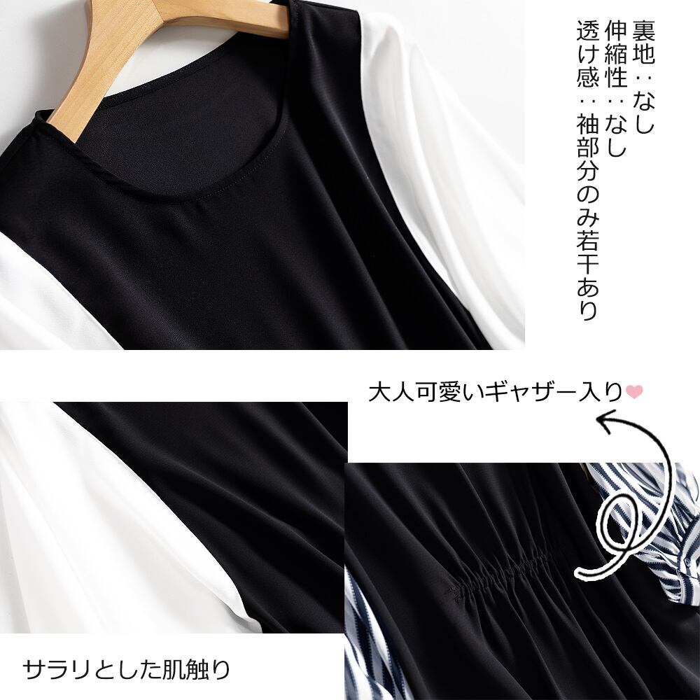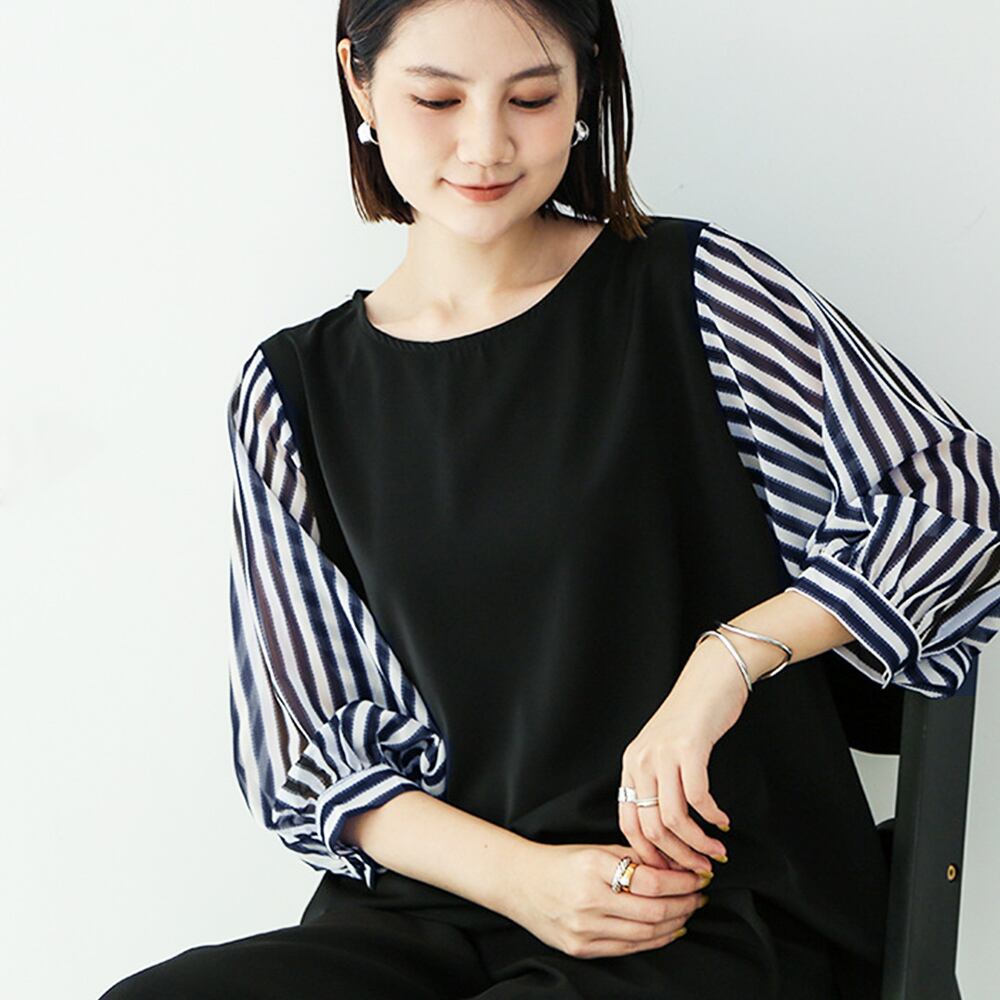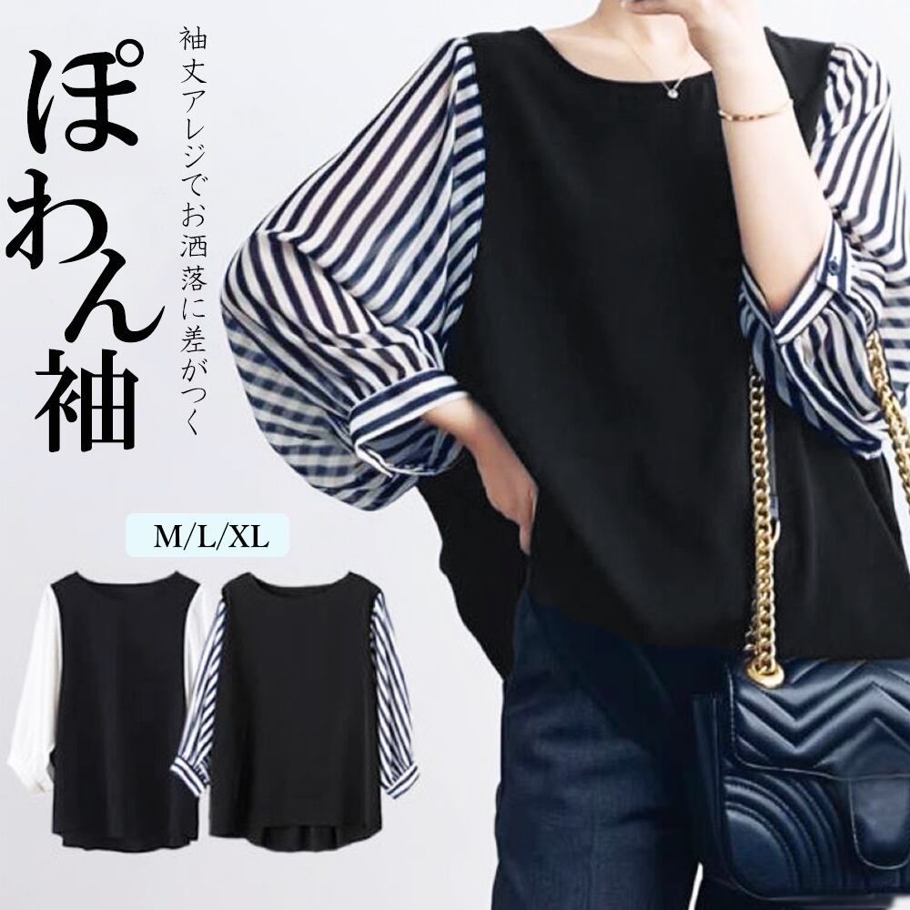 ドッキングトップス オフィスカジュアル レディース 着やせ ゆる 着回し 異素材 切り替え ボリューム袖 ストライプ