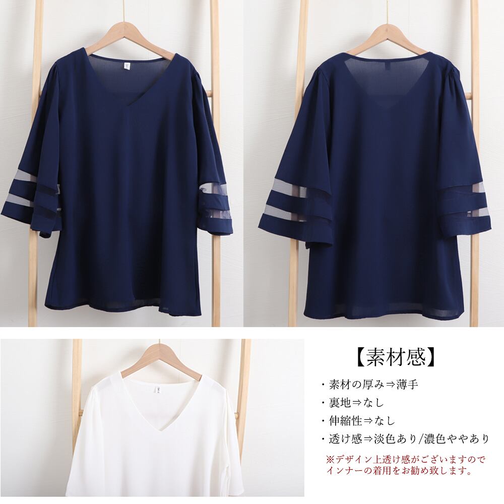 シフォンブラウス 白 七分袖 プルオーバー フレア袖 異素材切り替え フェミニントップス ゆったり体型カバー30代40代