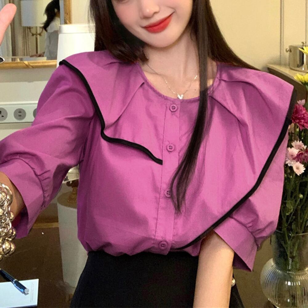 オフィスカジュアル シャツブラウス クルーネック 上品ブラウス 春秋 ビック襟 きれいめ 通勤 夏服大人可愛い 全3色
